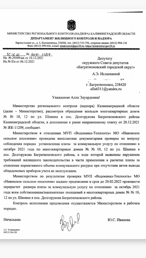 «Министерством по результатам проверки МУП «Водоканал-Теплосеть» МО «Нивенское сельское поселение» выдано предписание в срок до 20.02.2022 г. произвести перерасчёт размера платы за коммунальную услугу по отоплению за октябрь 2021 года всем собственникам/нанимателям помещений в многоквартирных домах №№ 10,12 по ул.Шанина в пос.Долгоруково Багратионовского района», - гласит ответ из министерства, полученный Аллой Исланкиной.
