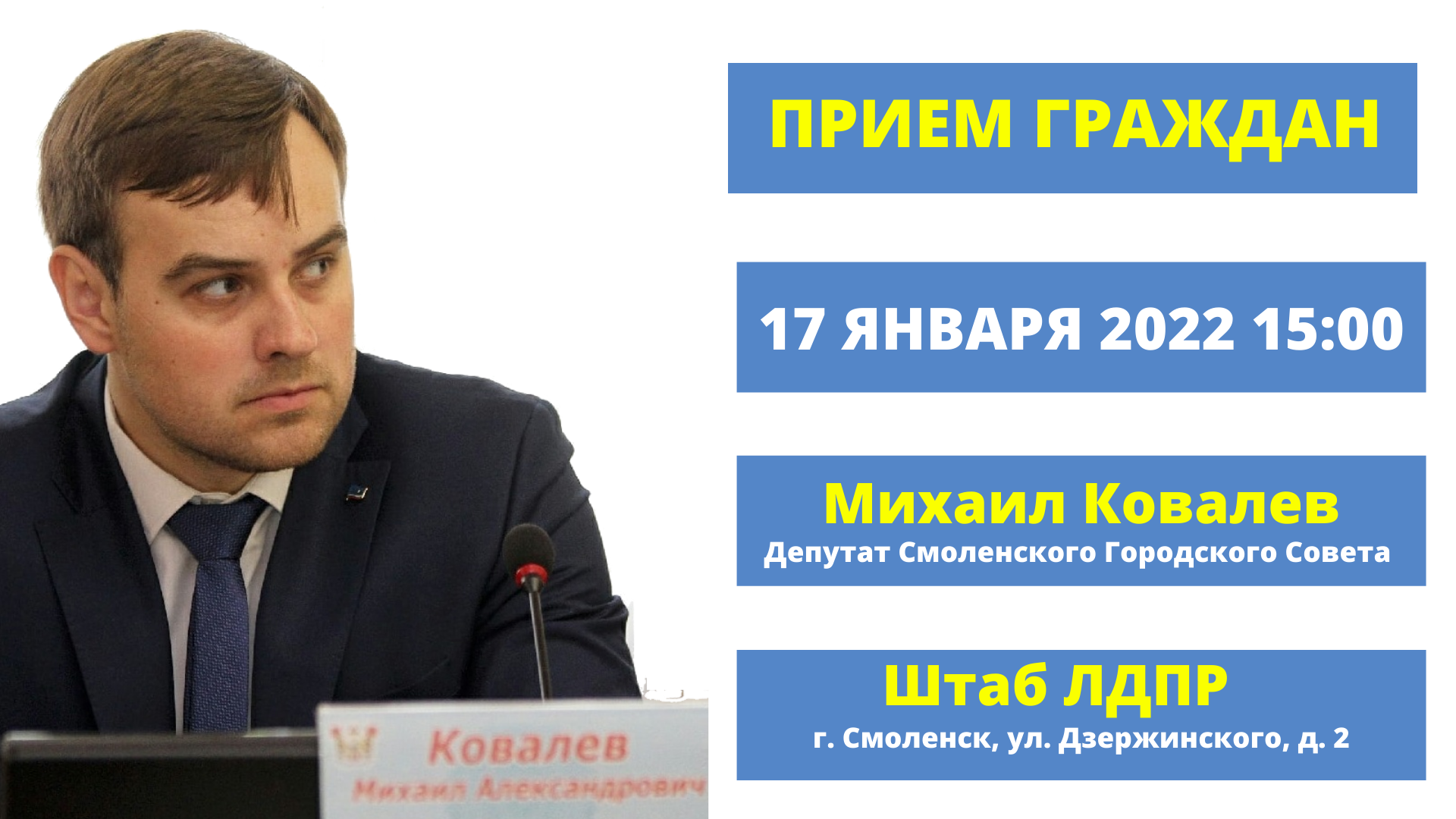 В стенах Смоленского регионального отделения ЛДПР депутат Смоленского Горсовета Михаил Ковалев проведет прием граждан. Смоляне могут обратиться к депутату по любым вопросам в понедельник, 17 января, с 15:00.
