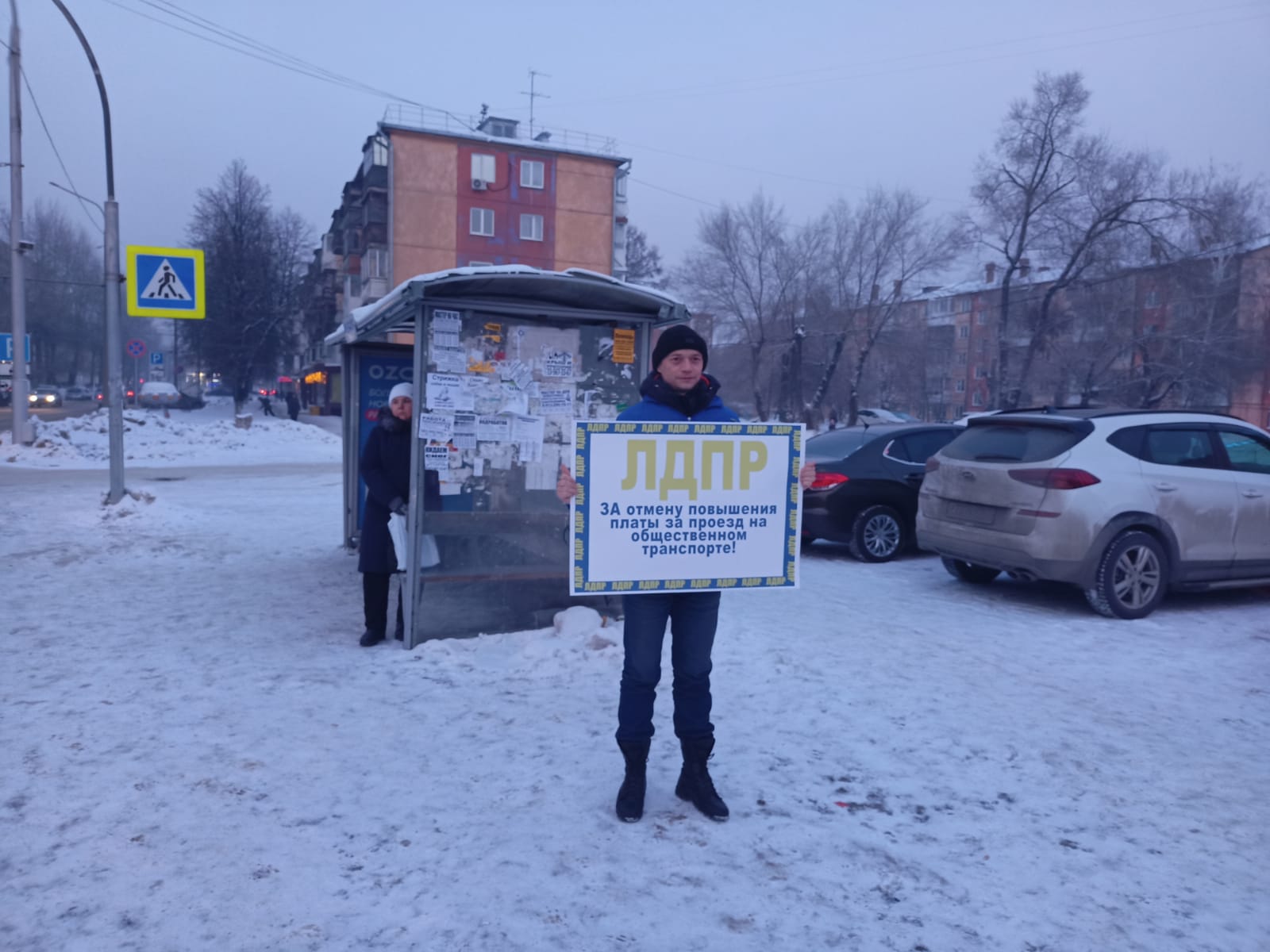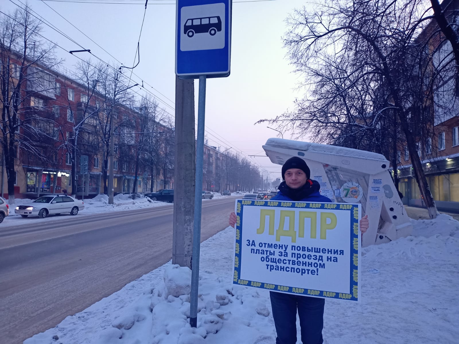 Координатор от ЛДПР в Кемерово Игорь Кальдиков вышел на одиночный пикет с лозунгом: «ЛДПР за отмену повышения стоимости проезда на общественном транспорте»