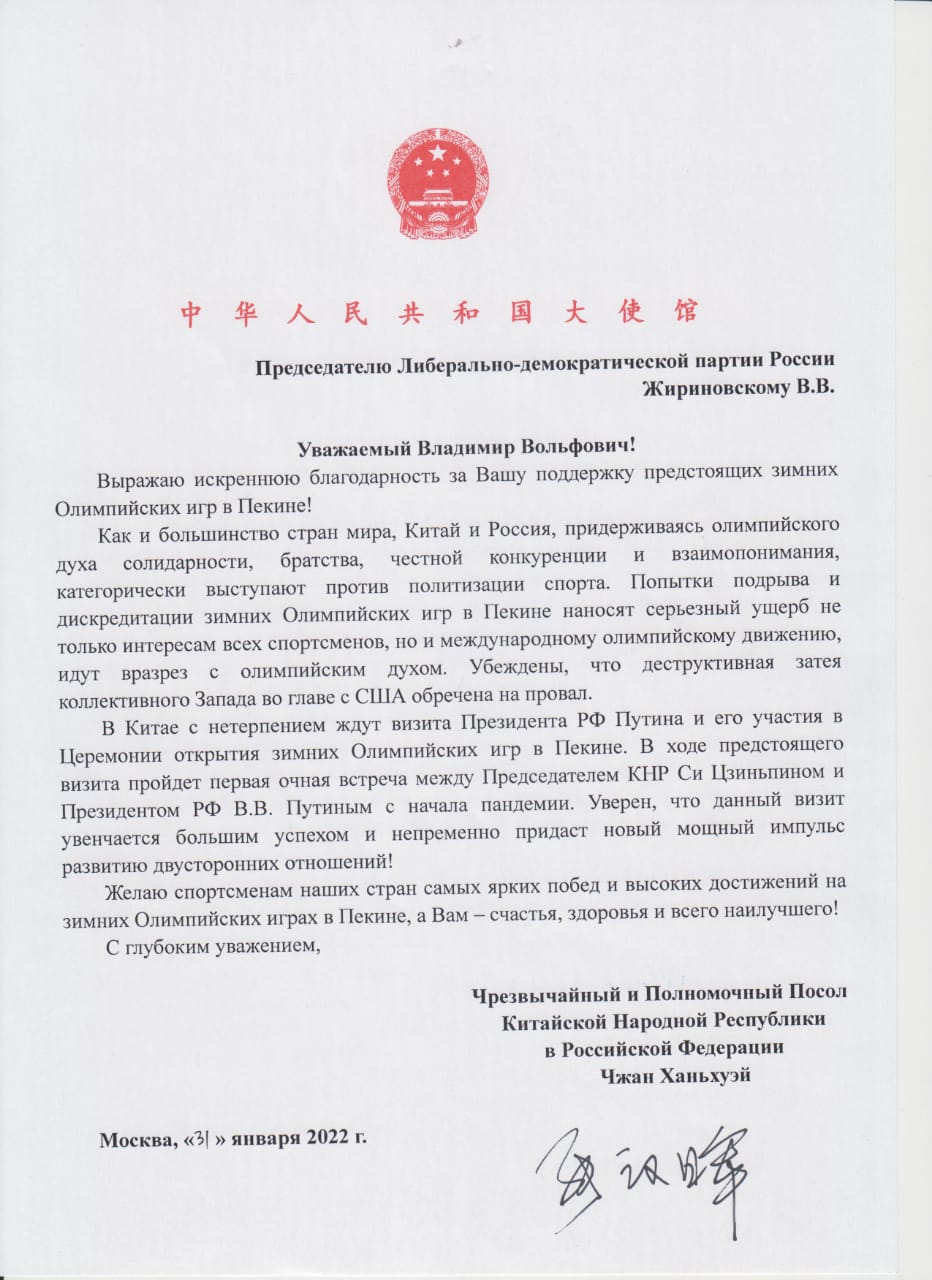 Чрезвычайный и Полномочный Посол Китайской Народной Республики в Российской Федерации Чжан Ханьхуэй также пожелал спортсменам обеих стран самых ярких побед и высоких достижений на зимних Олимпийских играх в Пекине, а Владимиру Жириновскому — счастья, здоровья и всего наилучшего.