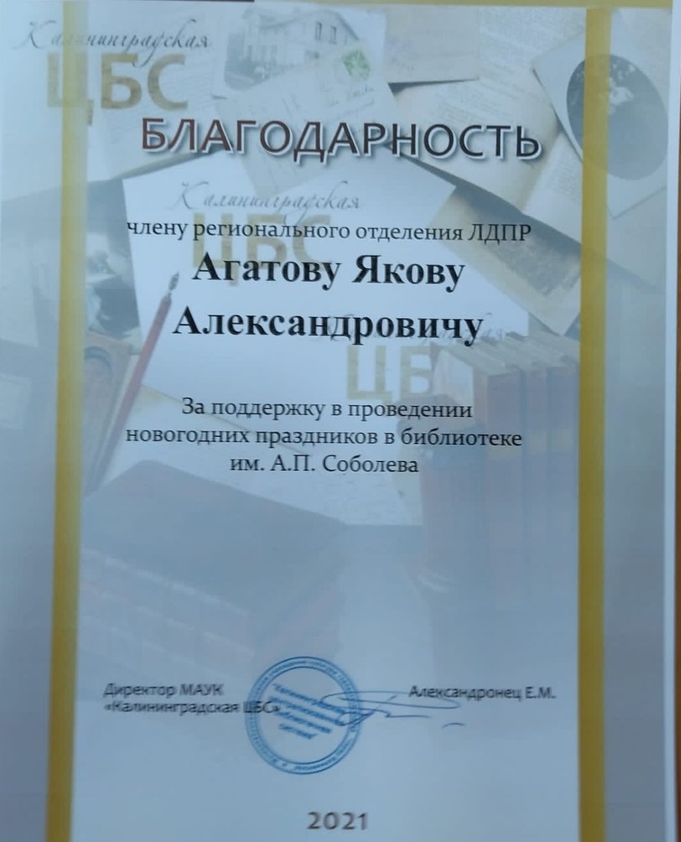 В библиотеке им. А.П.Соболева Калининграда вручили благодарственное письмо депутату ЛДПР Якову Агатову.