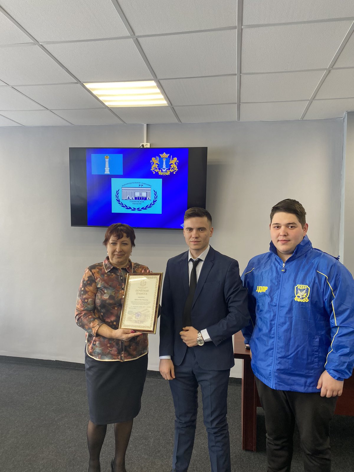 Олег Шурчалов - заместитель координатора Ульяновского реготделения ЛДПР по работе с молодёжью и Илья Кузьмин – помощник депутата фракции ЛДПР в Законодательном Собрании области Алексея Цибаркова приехали в среднюю школу №73, чтобы поздравить Нину Николаевну Ефимову – учителя начальных классов и вручить ей Почётную грамоту от Законодательного Собрания Ульяновской области за многолетний и добросовестный труд.