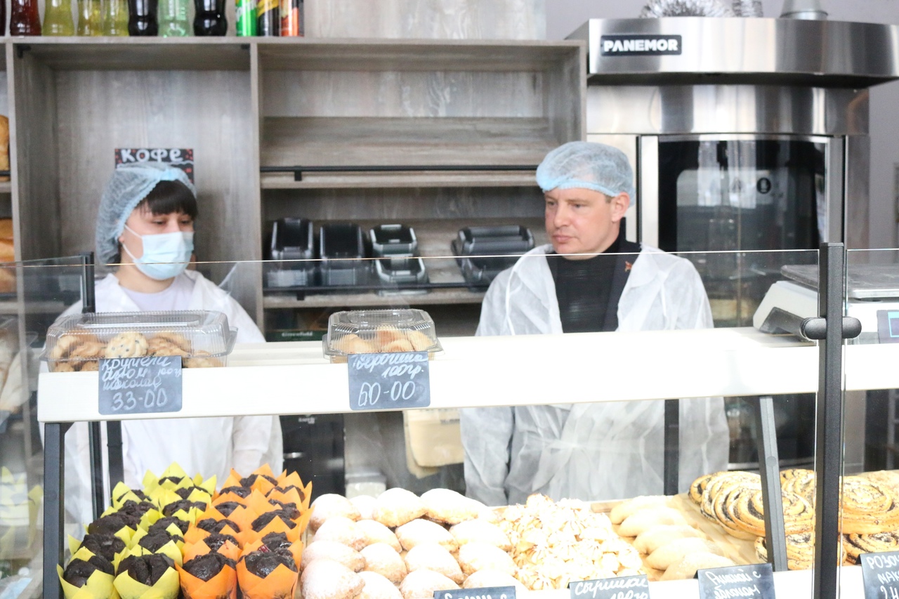 На витрине чего только нет – пирожки, пироги, сочни, домашние булочки и гамбургеры. В пекарне рассказали: гамбургеры приготовили сегодня в первый раз в качестве эксперимента, пока даже не установили цену, но пришедшие на аромат подростки уже смели половину. Представители ЛДПР вместе с журналистами переоделись в специальные костюмы и зашли на кухню. Основная продукция готовится утром, но и в течение дня работа кипит. На столе – заготовки для пирожков, как пояснил сотрудник, такие пирожки постные. В печи в это время подрумянивался хлеб. Всё свежее, вкусное и без добавок.