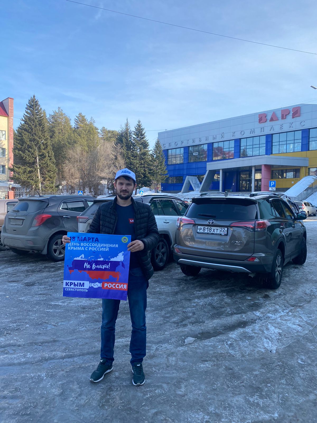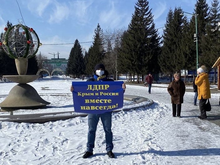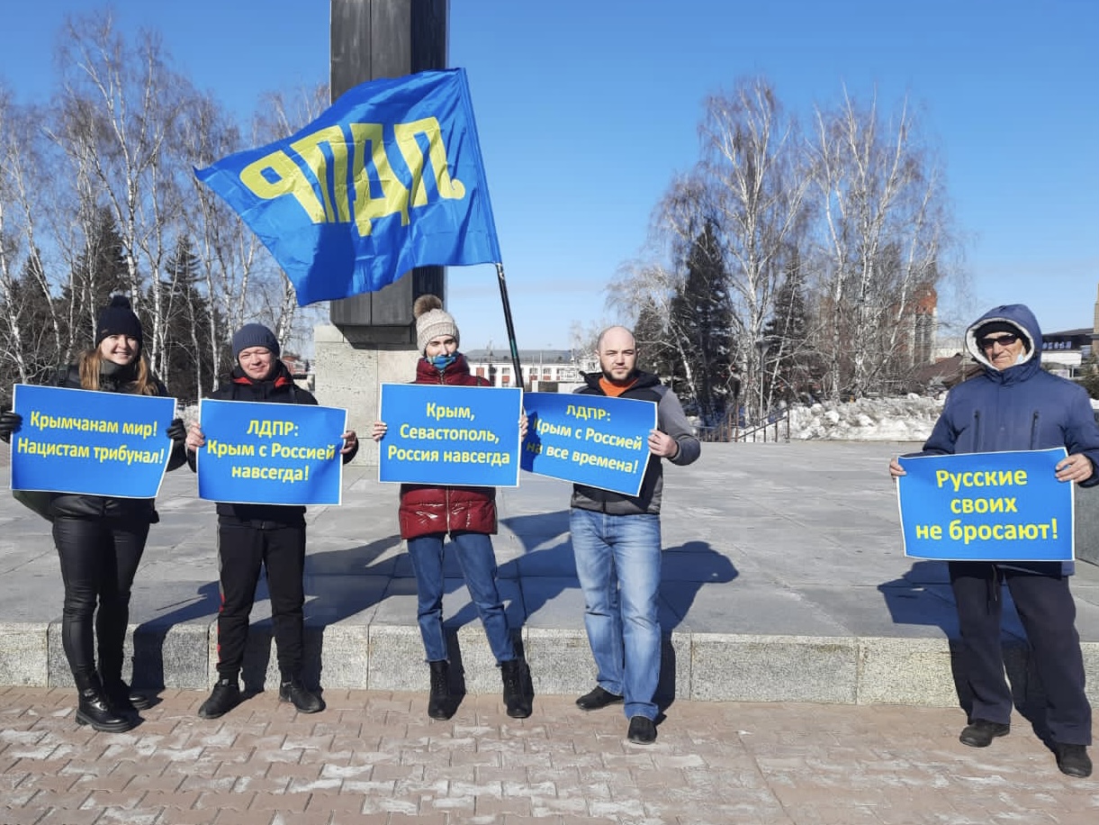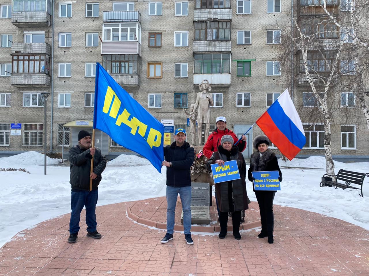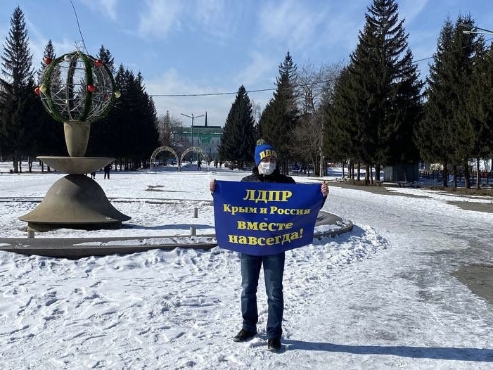 Координатор Бийского городского отделения ЛДПР Максим Железовский вместе с координаторами первичных отделений города Бийска присоединились к проведению пикетов в поддержку воссоединения Крыма и России.