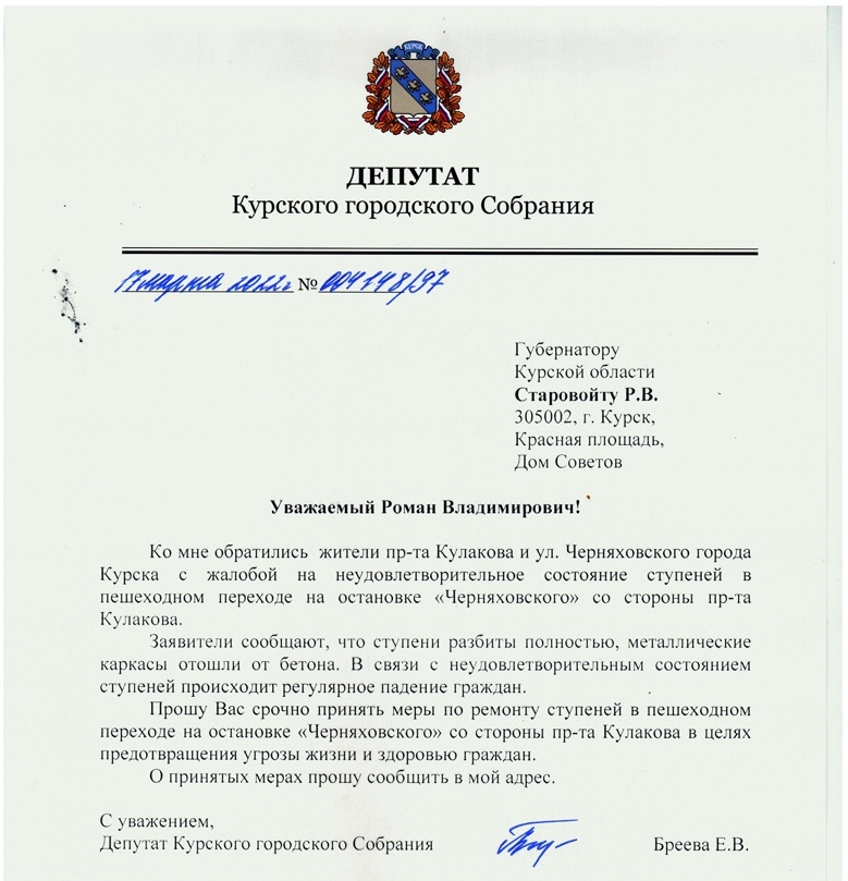 Со временем порожки начали рассыпаться. Уже даже металлический каркас отошел от бетонной основы. Люди спотыкаются и падают, получая травмы различной степени тяжести. Срочно требуется капитальный ремонт. О чем и сообщила в своем запросе Губернатору депутат Курского городского Собрания от ЛДПР Елена Бреева.