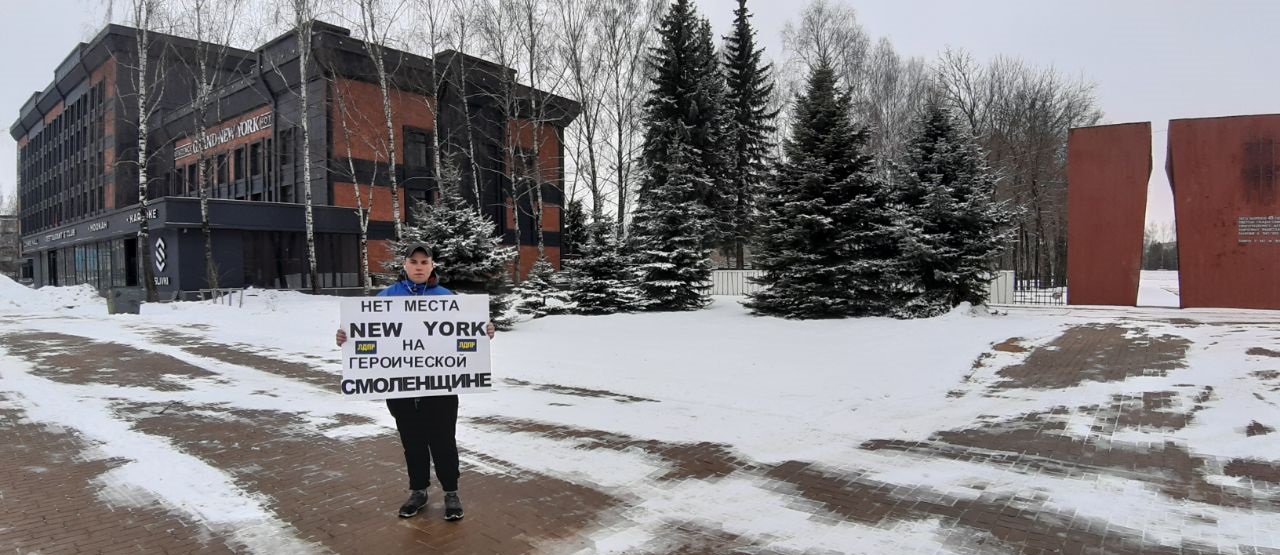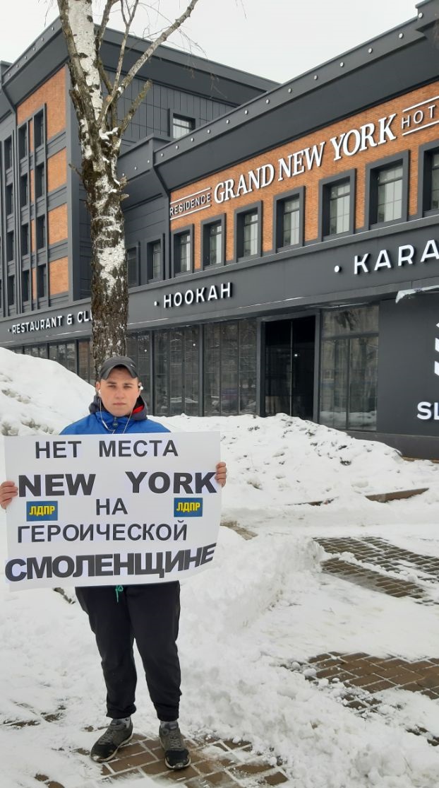 Активист молодежного крыла Смоленского реготделения ЛДПР Кирилл Иванов вышел на акцию протеста. Партиец счёл недопустимым открытие в областном центре гостинично - развлекательного комплекса c англоязычным названием NEW YORK, расположенного рядом с мемориалом памяти жертв фашизма