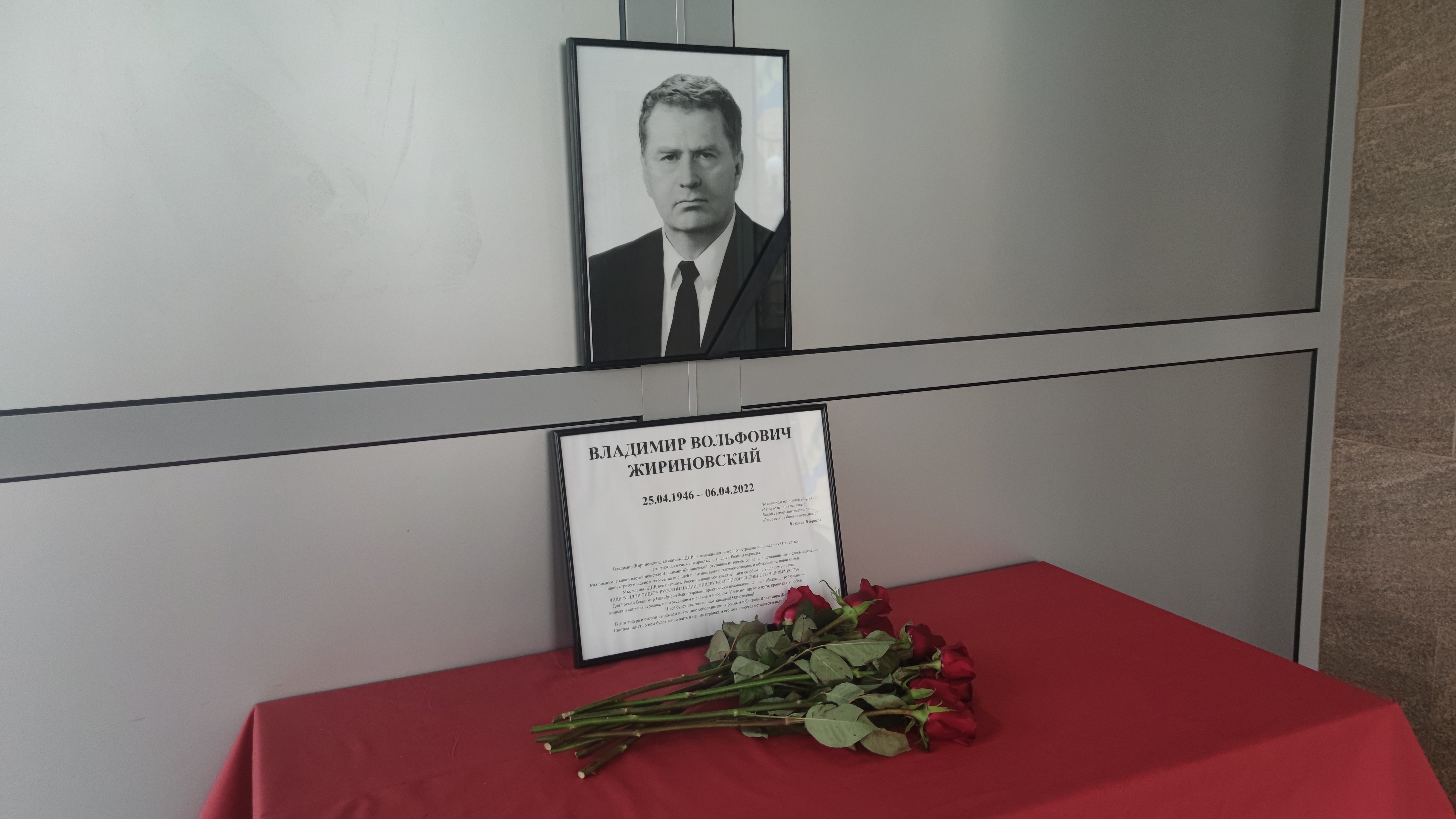 С самого утра к зданию Института Мировых Цивилизаций в Басманном переулке приносят цветы в память о Лидере ЛДПР, основателе вуза Владимире Жириновском