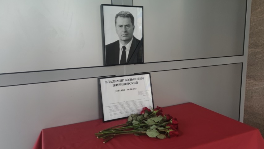 С самого утра к зданию Института Мировых Цивилизаций в Басманном переулке приносят цветы в память о Лидере ЛДПР, основателе вуза Владимире Жириновском