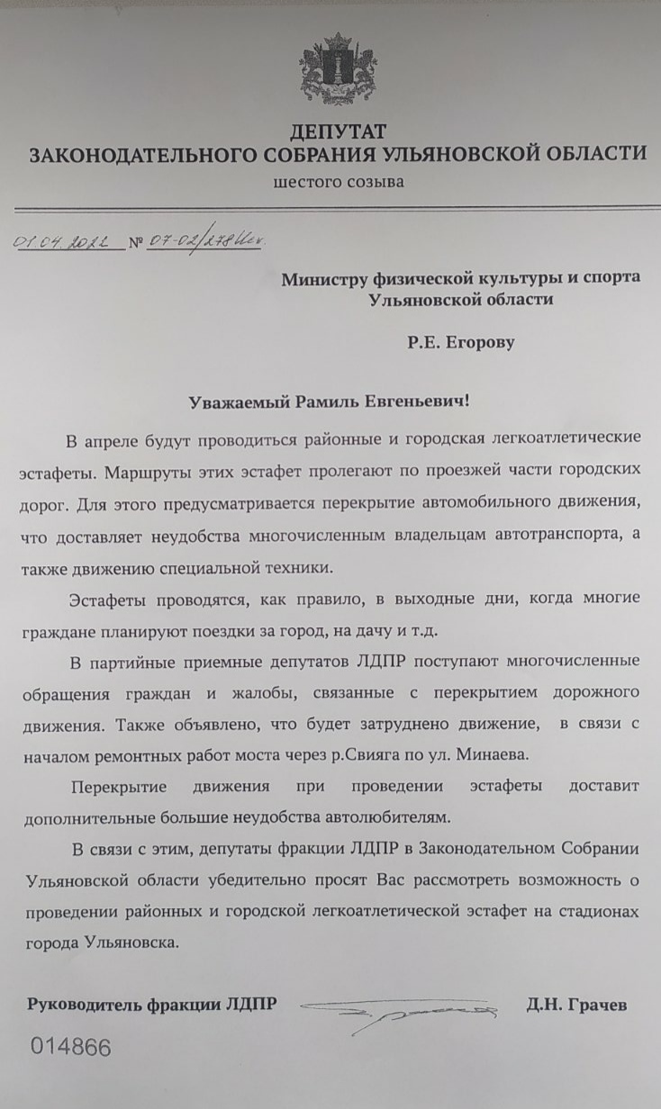 «Каждый год в Ульяновске проходят традиционные легкоатлетические эстафеты. Проблема заключается в том, что их маршруты пролегают по проезжей части центральных дорог, из-за чего движение автотранспорта перекрывается. Забеги проходят, как правило, в выходные дни, когда люди выезжают на дачи и за город, и подобные ограничительные меры доставляют, мягко говоря, неудобства многочисленным автолюбителям и усложняют движение спецтехники. Параллельно с этим, в настоящее время дорожные службы проводят ремонт моста через Свиягу, который является одной из главных транспортных артерий города, соединяющий Ленинский и Засвияжский районы. Фракция ЛДПР, руководствуясь многочисленными обращениями граждан, поступающими в наши депутатские приёмные, направила обращение министру спорта региона с просьбой перенести эстафеты с главных дорог на городские стадионы. Считаем, что следует учитывать интересы как спортсменов – бегунов, так и автомобилистов».