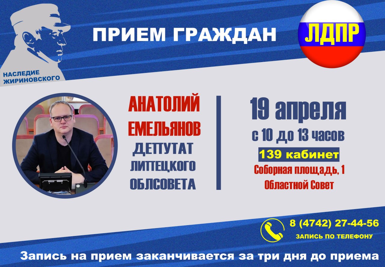 Депутат от ЛДПР Анатолий Емельянов проведет приём граждан в областном Совете 19 апреля с 10 до 13 часов