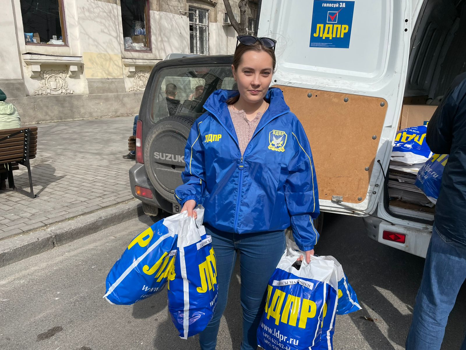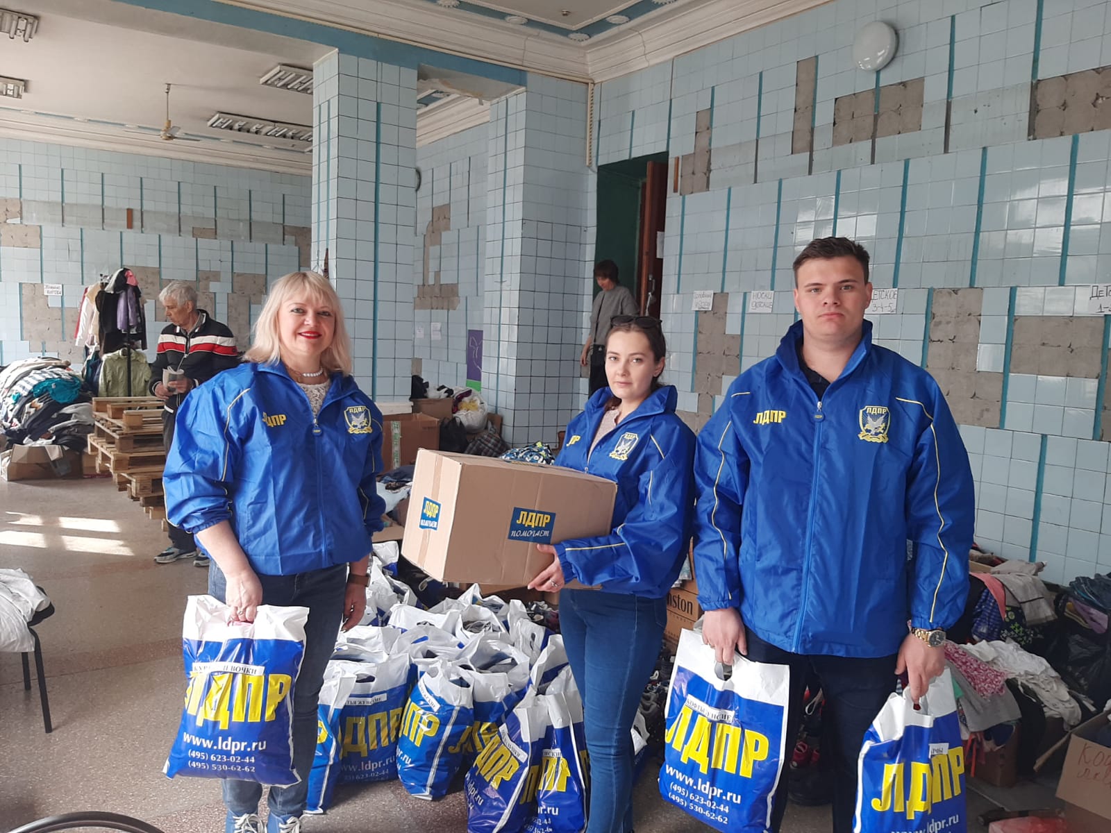 Координатор Ленинского отделения ЛДПР Виктория Этенко, координатор Гагаринского отделения Анастасия Столярова и помощник координатора по работе с молодежью Борис Этенко передали очередную партию вещей жителям Донбасса