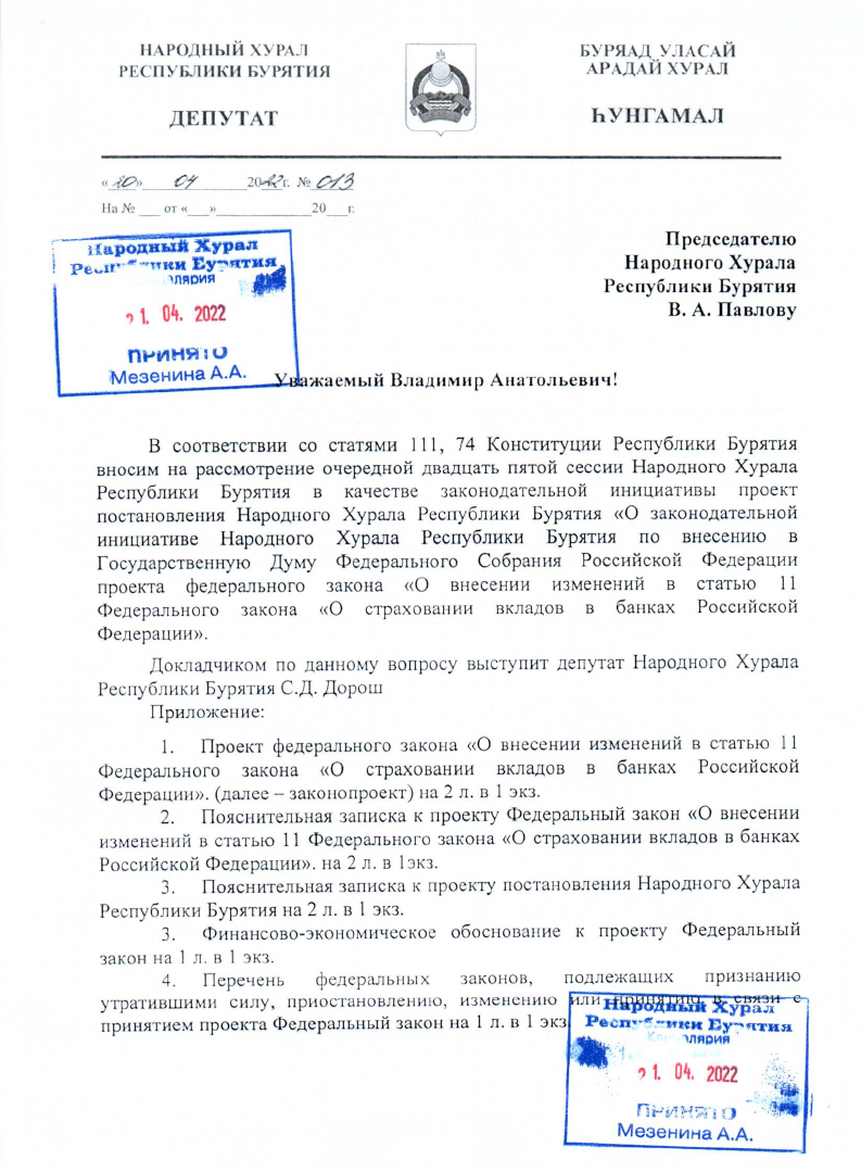 20 апреля 2022 года депутаты фракции ЛДПР в Народном Хурале Республики Бурятия внесли проект федерального закона «О внесении изменений в статью 11 Федерального закона «О страховании вкладов в банках Российской Федерации»