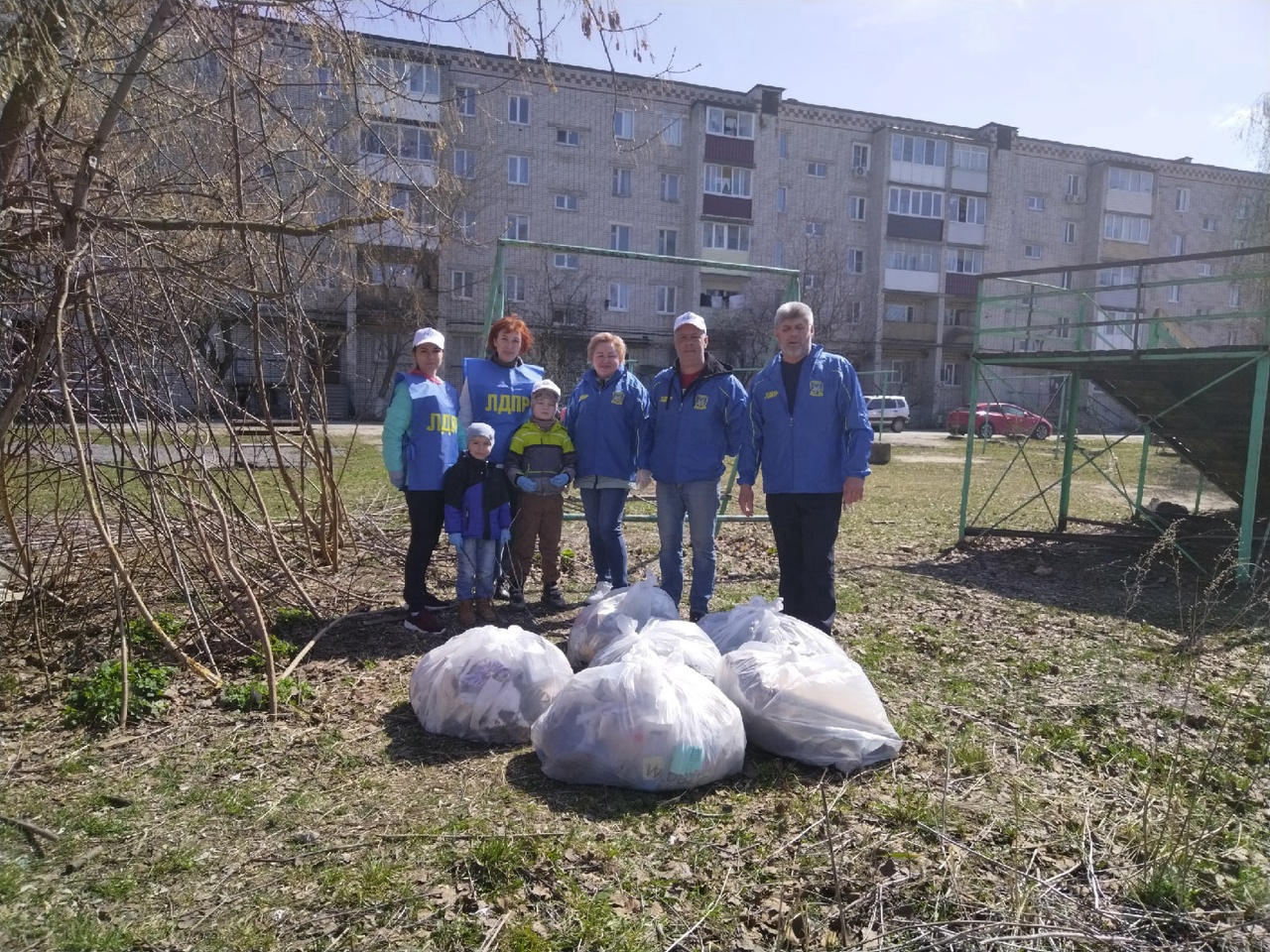 Представители ЛДПР, неравнодушные граждане и их дети собрали несколько мешков мусора, очистив двор от сухих веток, фантиков, бутылок.