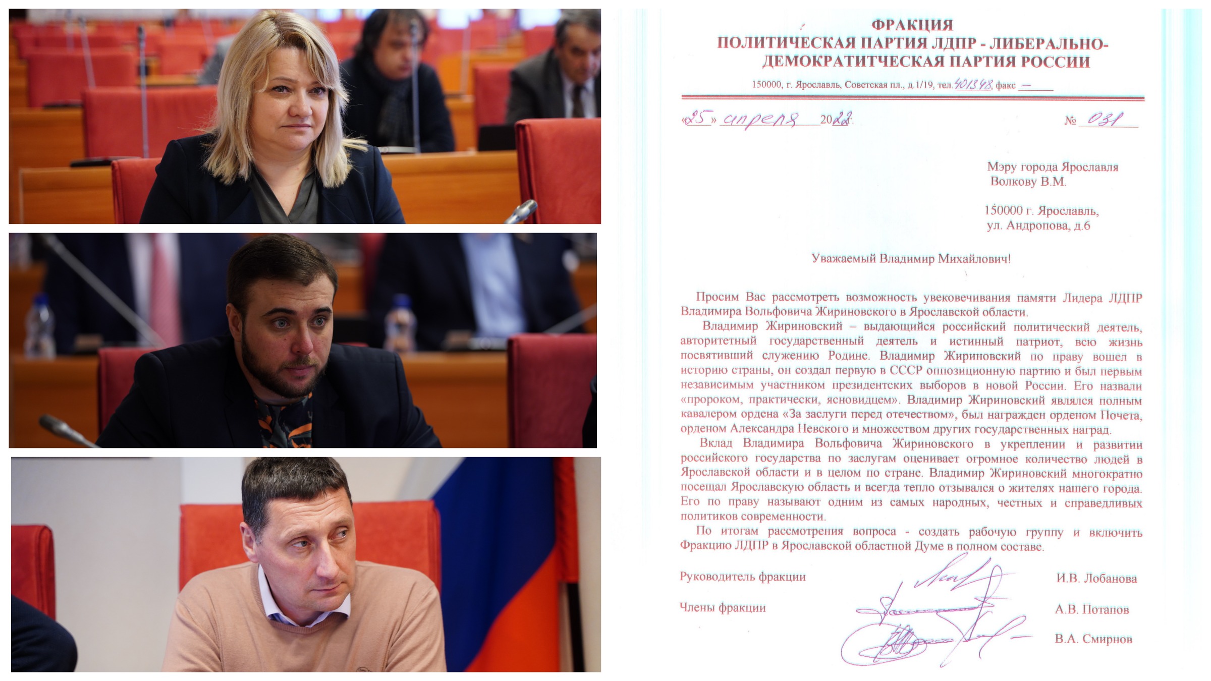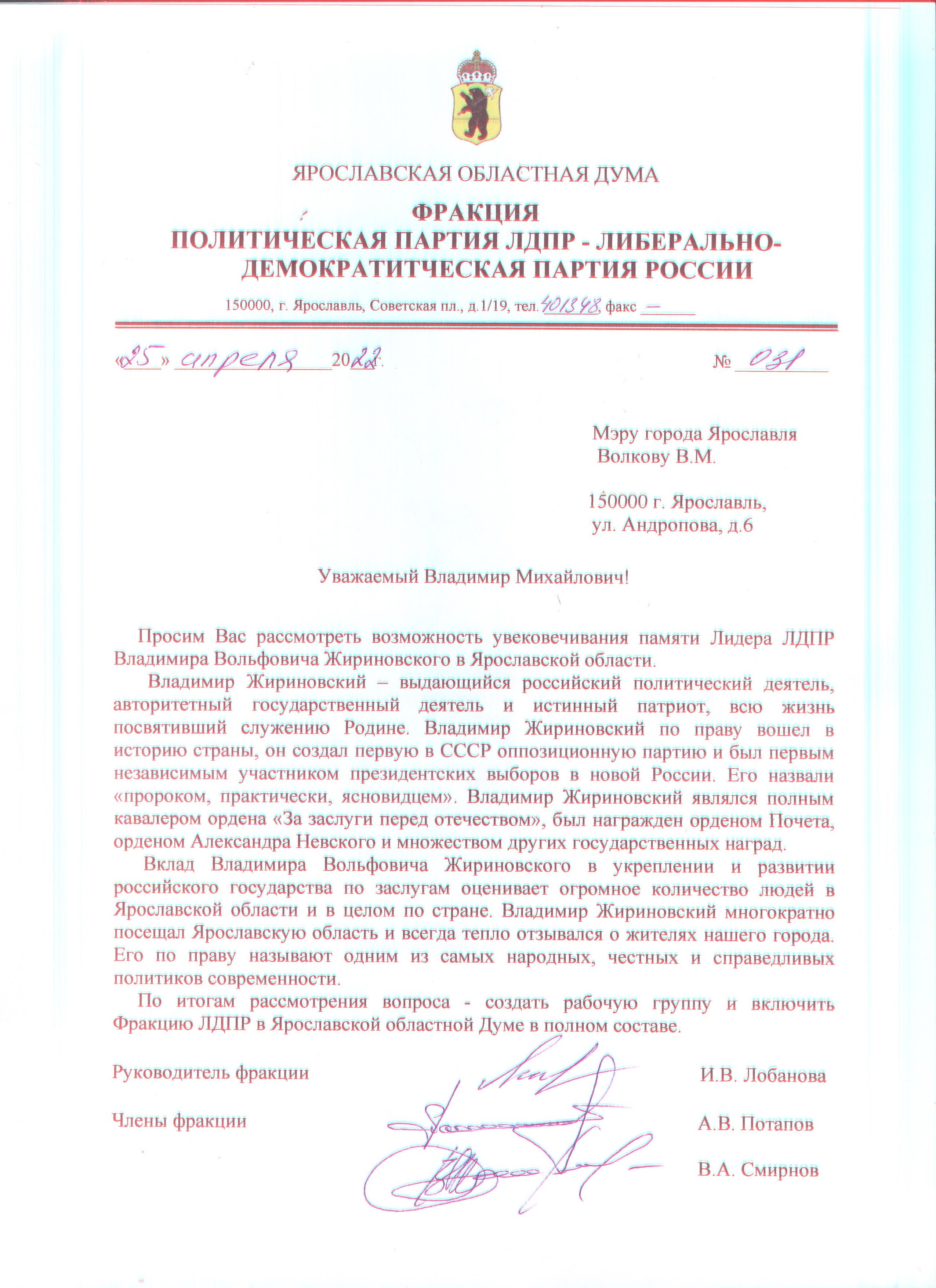 Депутаты фракции ЛДПР в Ярославской областной Думе обратились к губернатору и к мэру по вопросу увековечивания памяти Владимира Жириновского