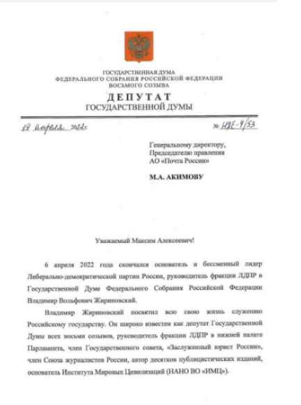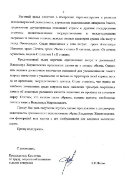 Ярослав Нилов предложил «Почте России» сделать марки с изображением Лидера ЛДПР Владимира Жириновского. Соответствующее обращение парламентарий направил гендиректору организации Максиму Акимову.