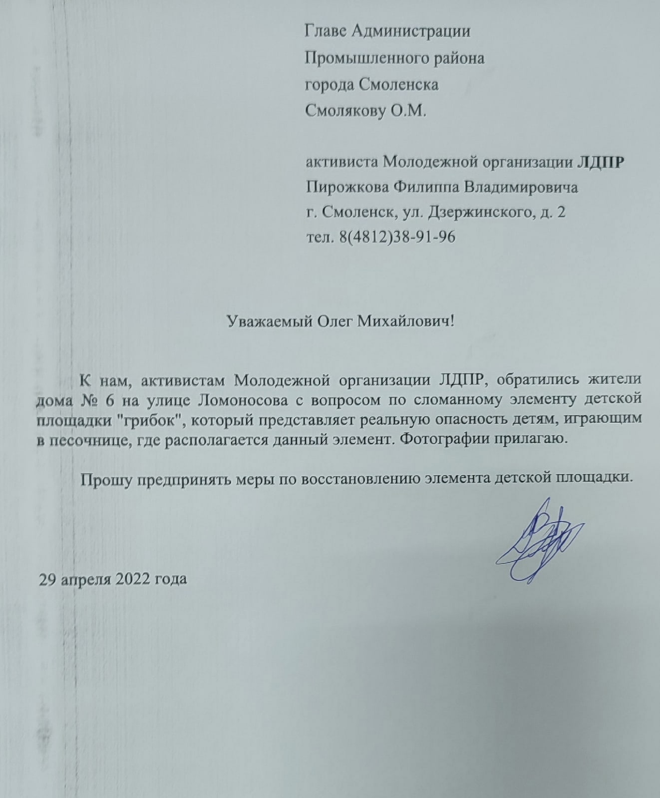 Активист Филипп Пирожков направил обращение в Администрацию Промышленного района с просьбой предпринять меры по восстановлению "грибка".