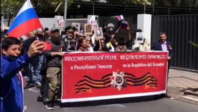 Он — председатель Координационного совета российских соотечественников в Эквадоре. Участниками акции стали выпускники российских вузов, соотечественники и представители посольства. С флагами и портретами своих близких, защищавших родину в годы Великой Отечественной войны, они прошли по улицам Кито в районе посольства России и спели «Катюшу».