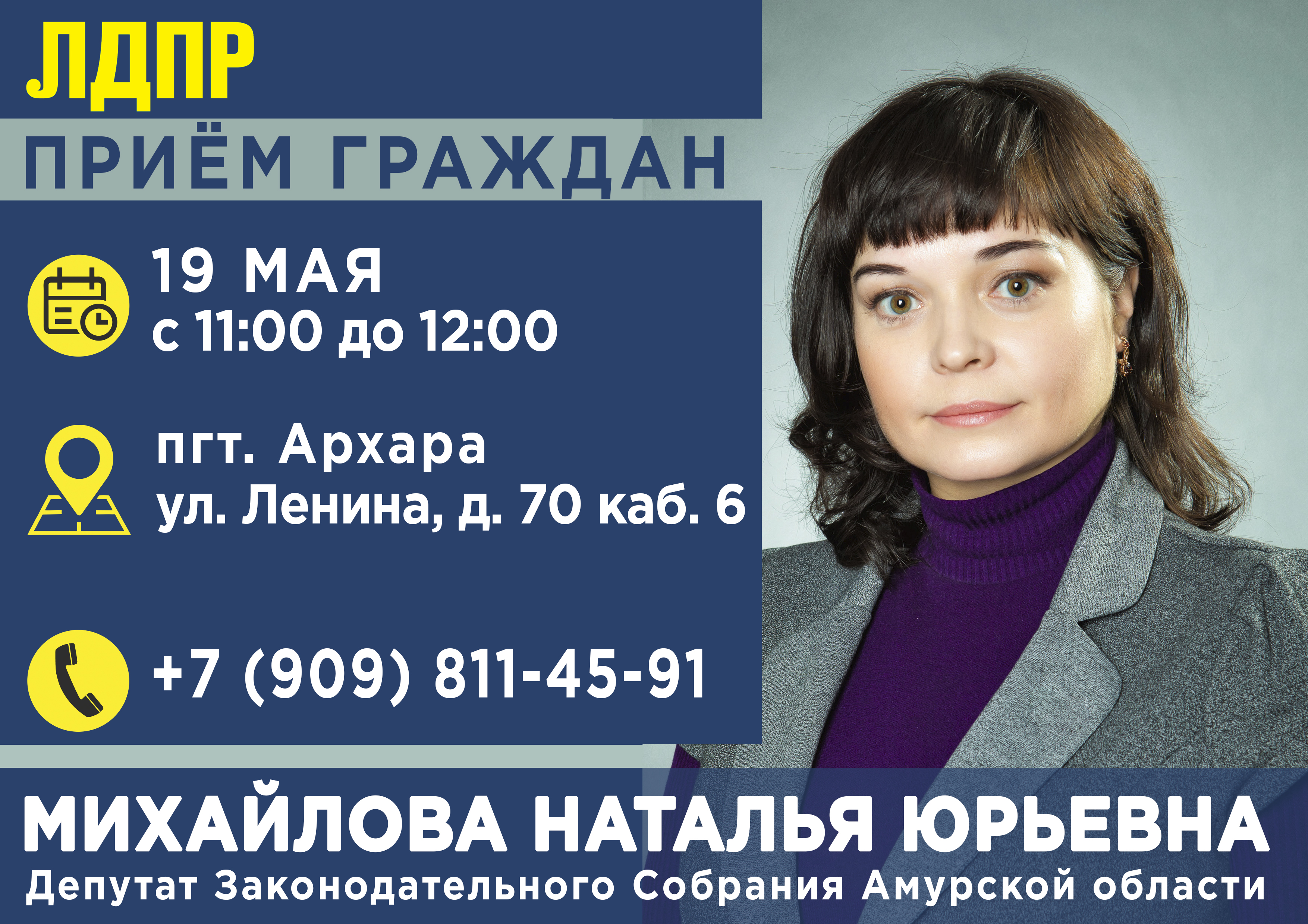 Руководитель фракции ЛДПР в Амурской области Наталья Михайлова проведет прием граждан. Архаринцы смогут рассказать политику о своих проблемах