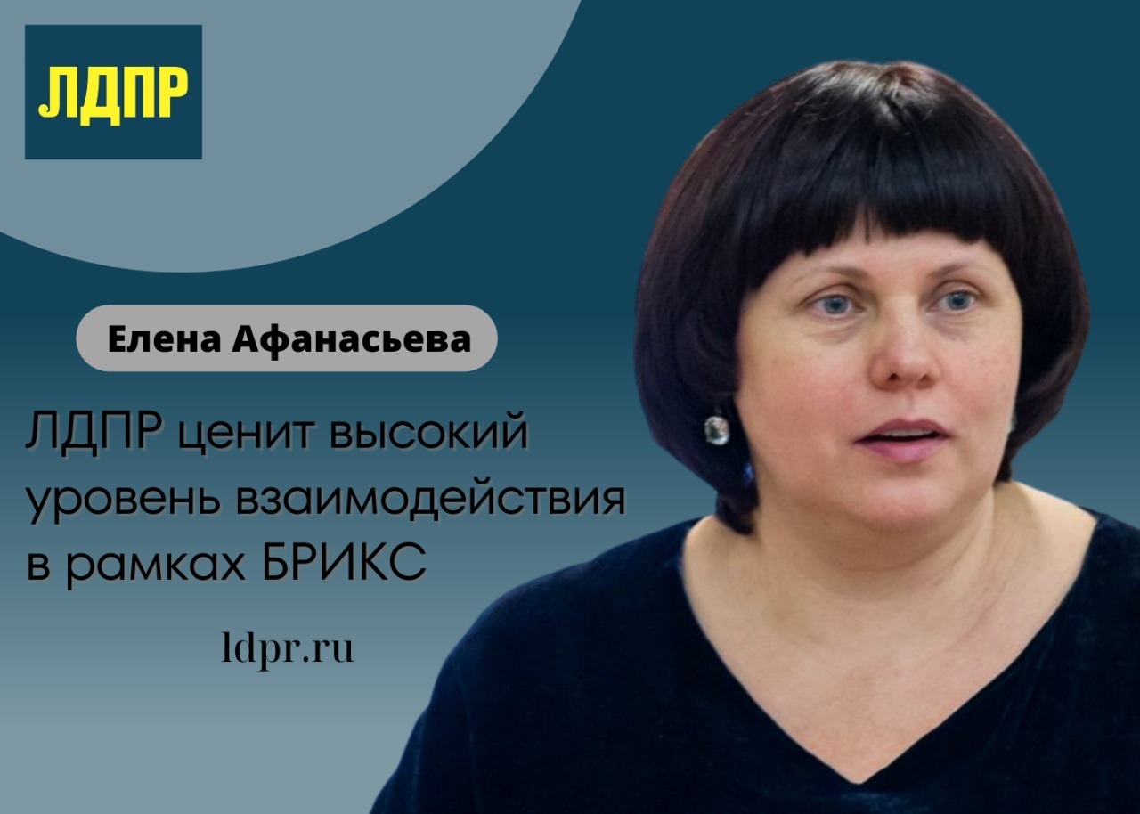 «ЛДПР ценит высокий уровень взаимодействия в рамках БРИКС, самостоятельность в формировании общего видения более демократического мироустройства с учётом интересов развивающегося мира и государств с развивающейся экономикой», - заключила Елена Афанасьева