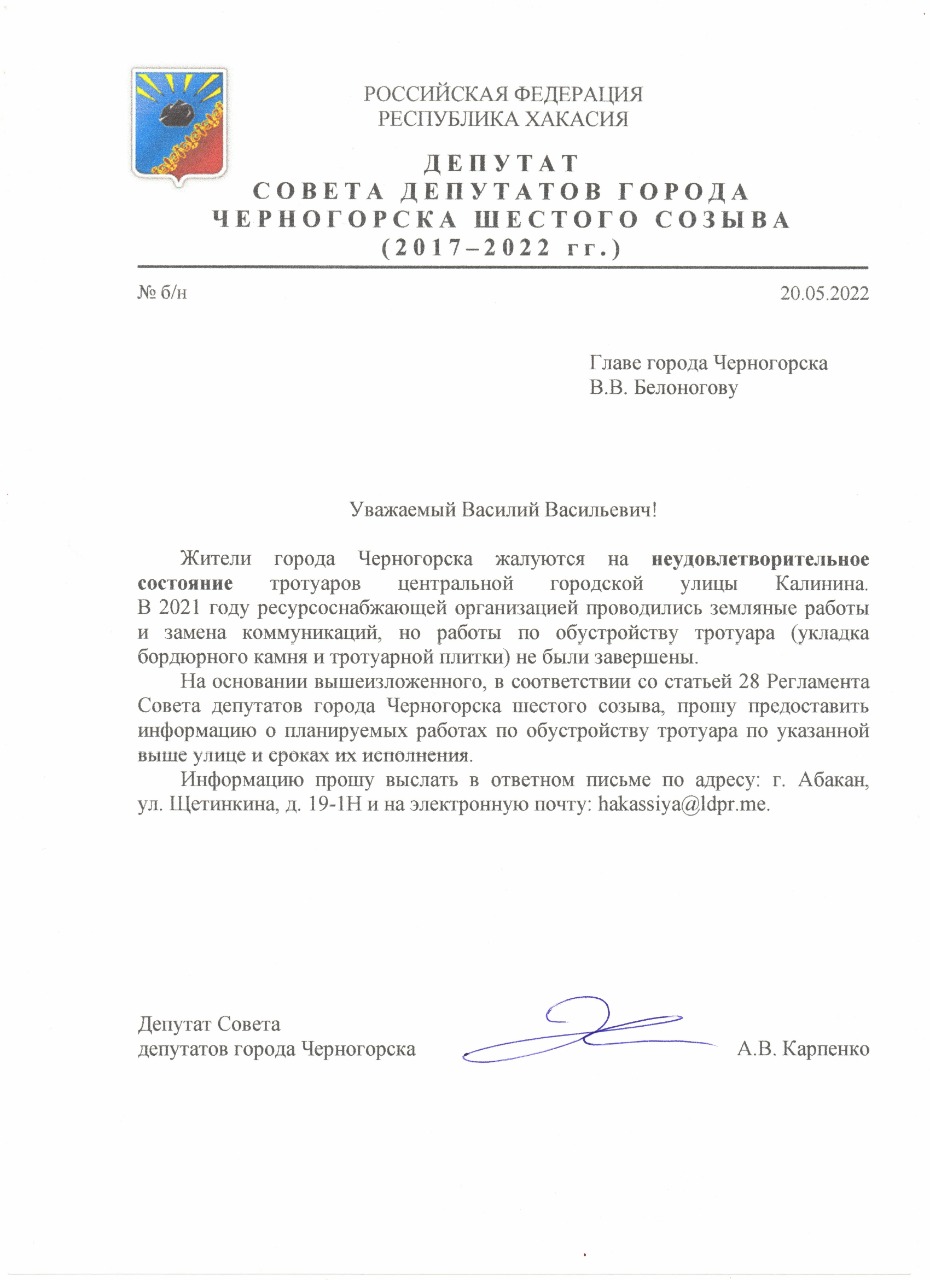 Депутат Черногорского Совета депутатов от ЛДПР Алексей Карпенко обратился к Главе города Черногорска Белоногову Василию Васильевичу с требованием предоставить информацию о планируемых работах по обустройству тротуара на ул. Калинина и сроках исполнения.
