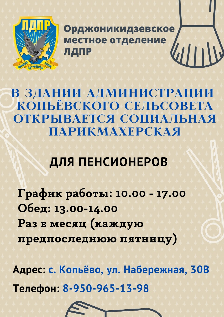 Парикмахерская начнет работу 17 июня в здании Администрации Копьёвского сельсовета по адресу: с. Копьёво, ул. Набережная, 30В. Записаться на стрижку можно по телефону: