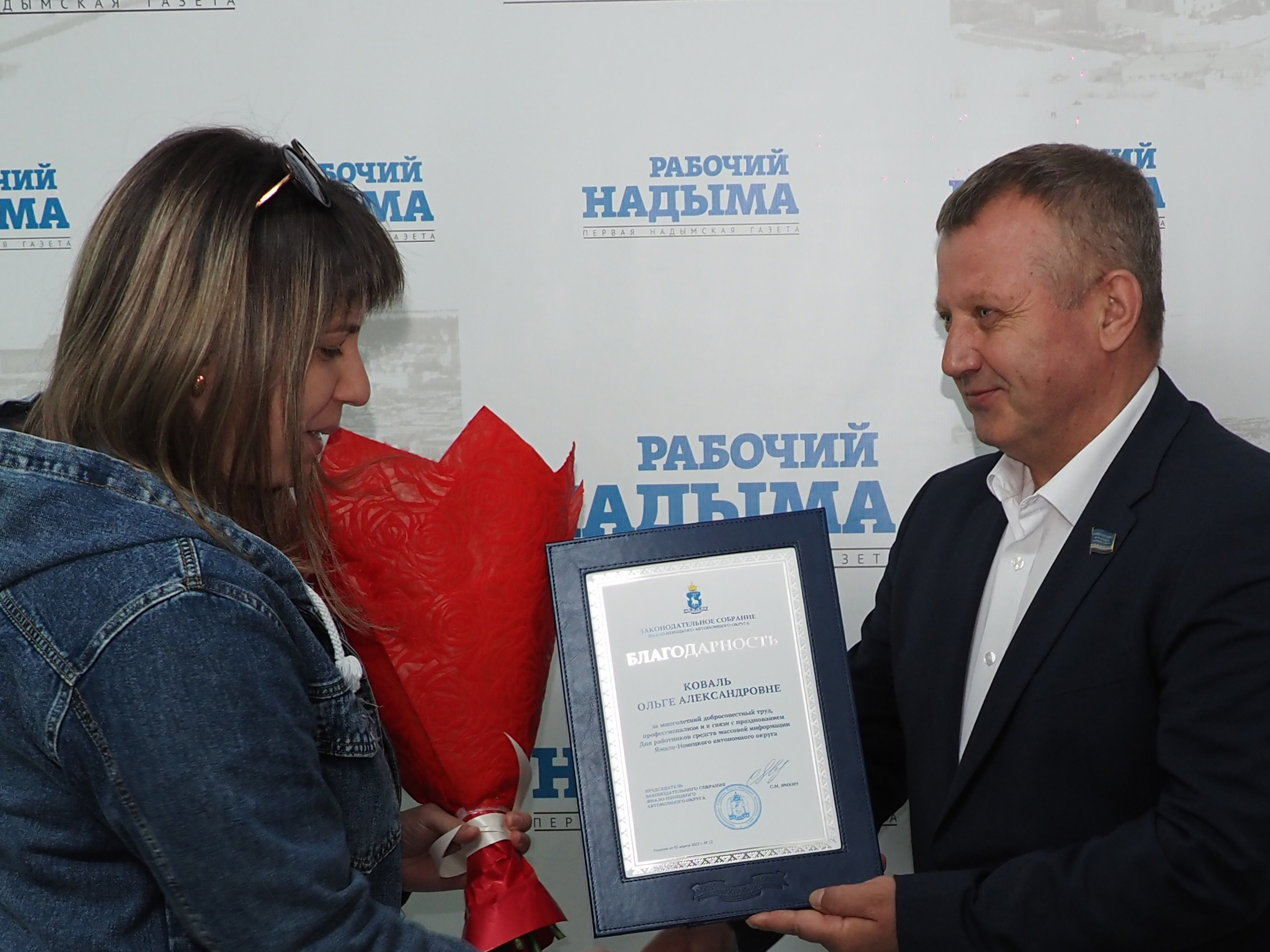 За многолетний добросовестный труд и профессионализм начальнику отдела компьютерного обеспечения и выпуска редакции газеты "Рабочий Надыма" Ольге Коваль депутат Александр Голубенко вручил Благодарность Законодательного Собрания ЯНАО.