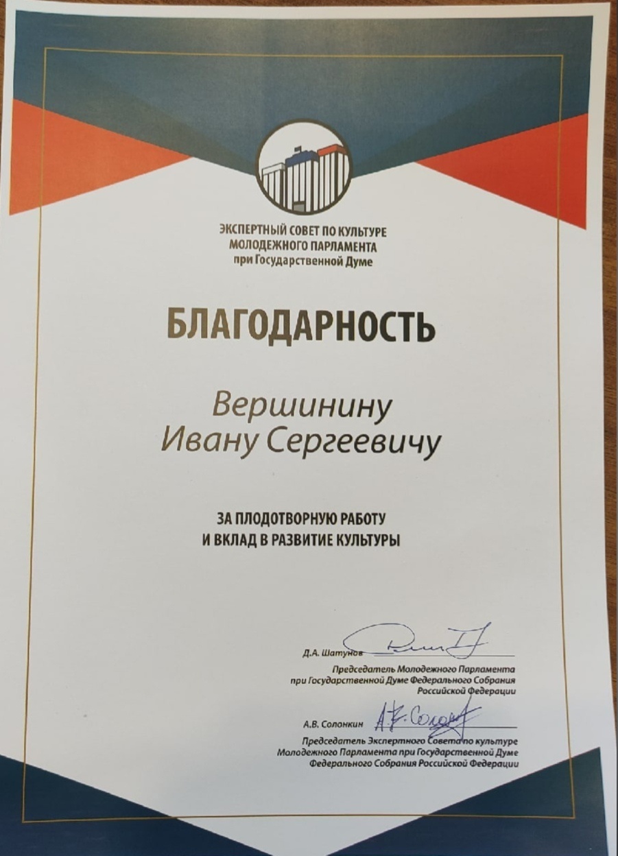 Заместитель руководителя фракции ЛДПР Тюменской областной Думы Иван Вершинин отмечен Благодарностью Экспертного Совета по культуре Молодежного Парламента при Государственной Думе РФ за плодотворную работу и вклад в развитие культуры