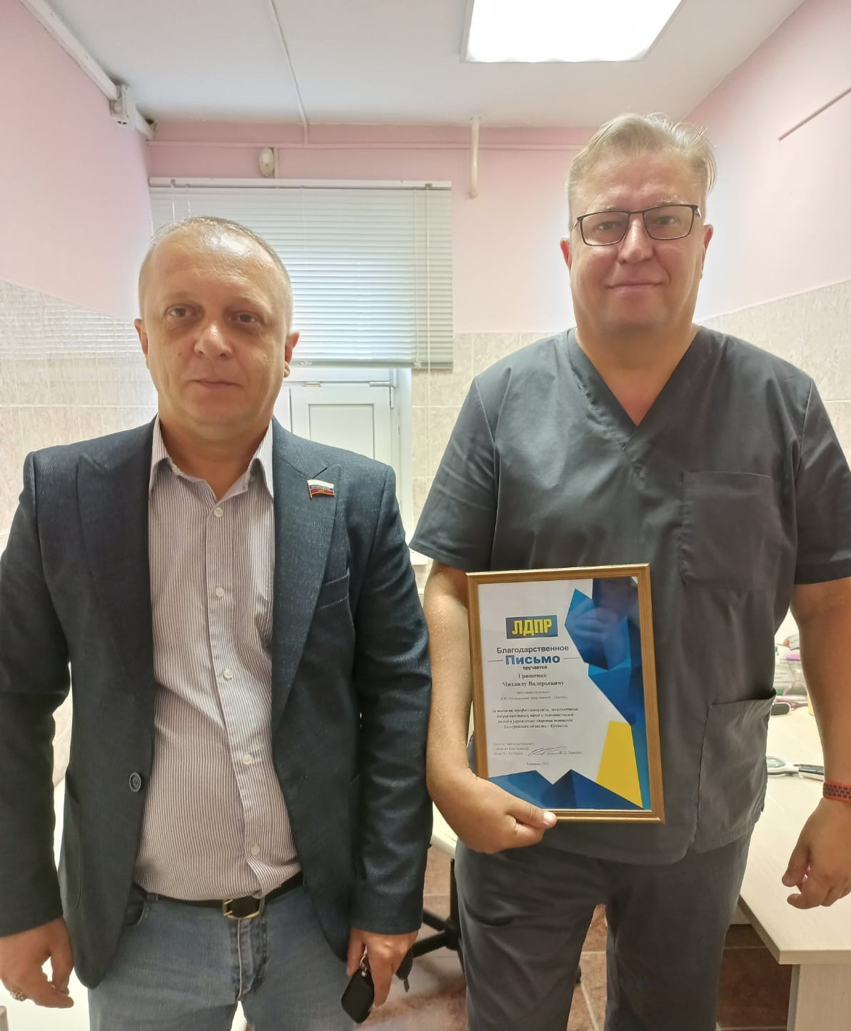 Помощники депутата Госдумы от ЛДПР Олег Тересков и Павел Маликов в честь Дня медицинского работника вручили благодарственное письмо от депутата Парламента Кузбасса Кирилла Правдина врачу медицинского центра «Земский докторъ» Михаилу Грищенко