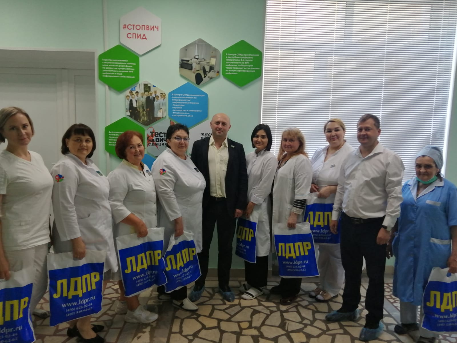 В этот праздничный день координатор Башкортостанского регионального отделения ЛДПР, депутат Совета ГО г. Уфа Юрий Рудаков совместно с активистом регионального отделения Владимиром Малышевым посетили ГБУЗ Республиканский центр по профилактике и борьбе со СПИДом и инфекционными заболеваниями. В ходе встречи Юрий Рудаков поблагодарил медицинский персонал Республиканского центра за их неоценимый труд и внимательное отношение к пациентам, а также поздравил их с профессиональным праздником, вручив памятные подарки от ЛДПР.