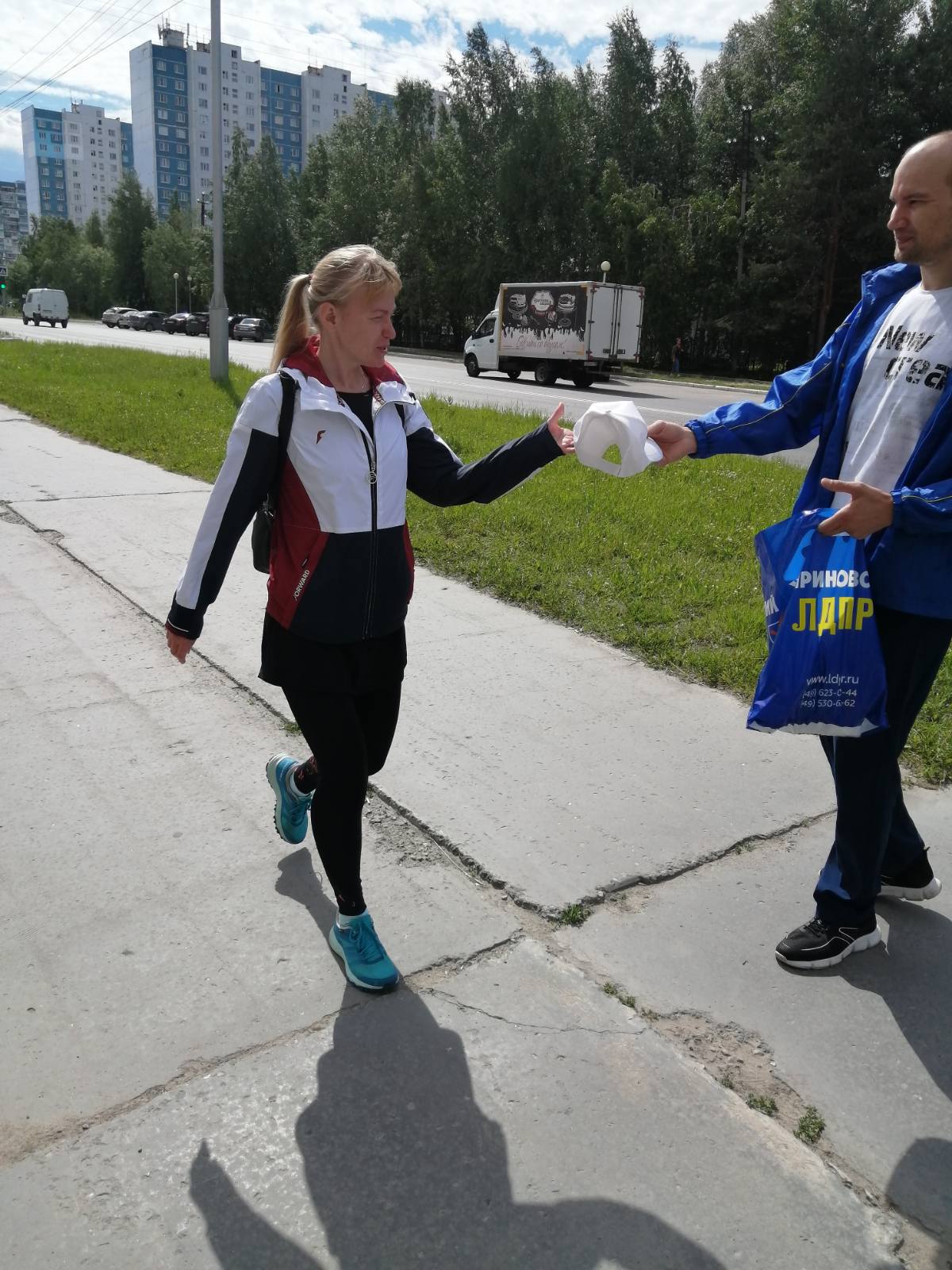 Жителям города и особенно молодому поколению вручали флажки РФ, футболки, кепки и воздушные шары с логотипом ЛДПР.