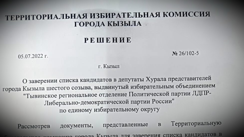 Решением Территориальной избирательной комиссии г. Кызыла от 05 июля 32022 года №26/102-5 был заверен список кандидатов в депутаты Хурала представителей г. Кызыла шестого созыва, выдвинутых избирательным объединением Тывинским региональным отделением ЛДПР.