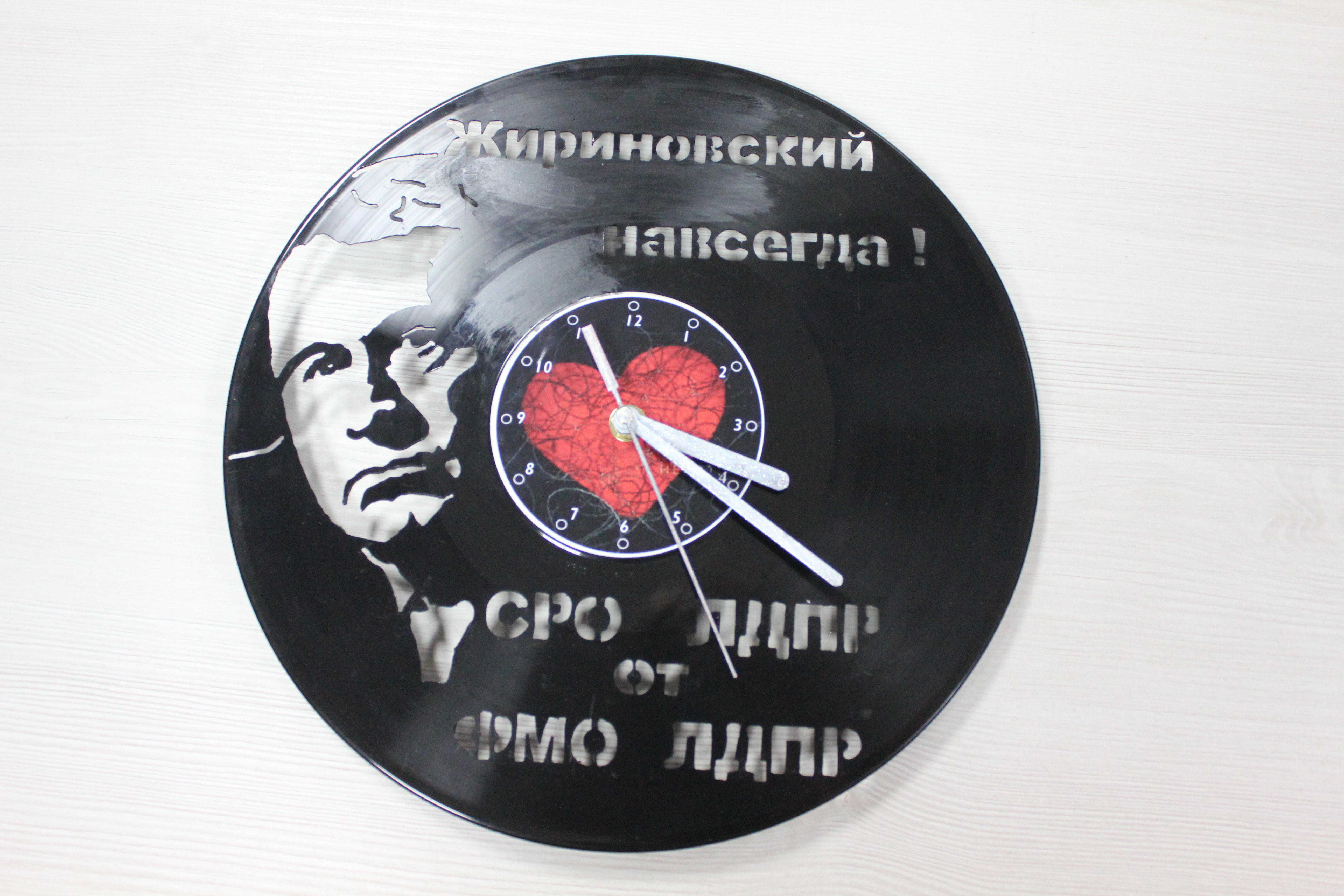 Партийцы создали уникальные часы из виниловой пластинки с изображением Основателя ЛДПР. Подарок изготавливали на специальном оборудовании, предназначенном для лазерной резки и гравировки.