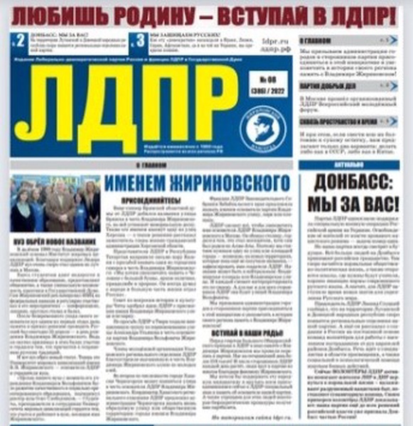 Продолжается Общероссийский приём в партию памяти Владимира Жириновского. А улицы и площади населенных пунктов страны переименовываются в честь Основателя ЛДПР. Волонтеры ЛДПР помогают Донбассу — задачу сделать всё возможное, чтобы помочь дончанам, поставил лидер партии Леонид Слуцкий. Об этом и многом другом читайте в новом номере газеты ЛДПР № 08 (386) / 2022
