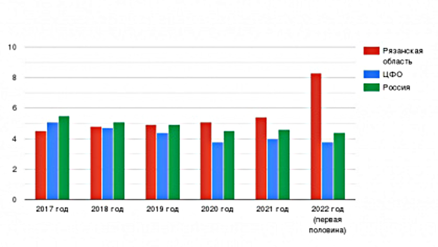 Из приведённого графика видно, что младенческая смертность в Рязанской области в два раза выше, чем по всей стране.