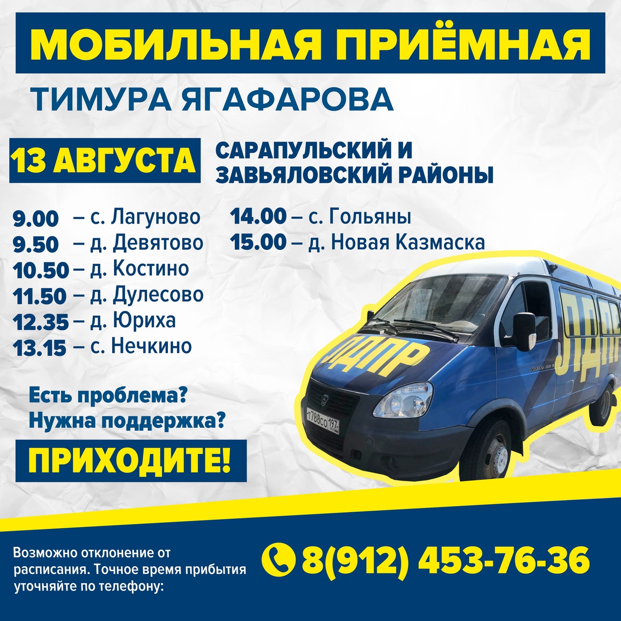 В субботу, 13 августа, Мобильная приемная ЛДПР будет работать в Сарапульском и Завьяловском районах Удмуртии