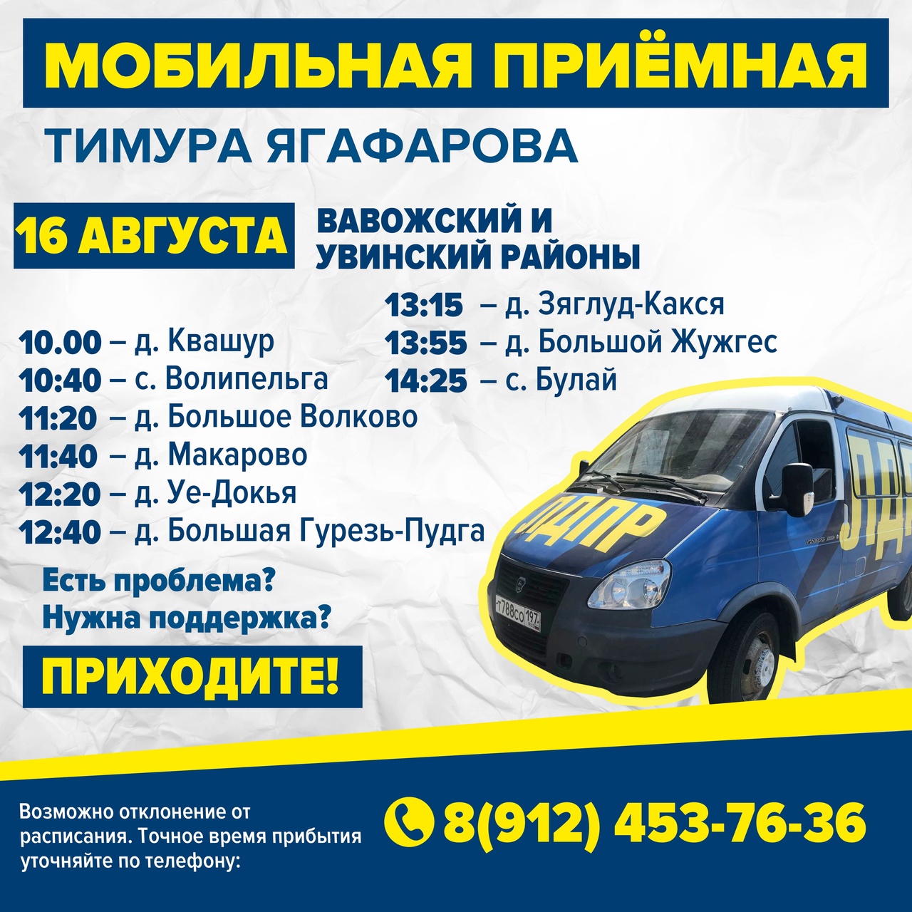 В среду, 17 августа, Мобильная приемная ЛДПР будет работать в Увинском и Завьяловском районах Удмуртии