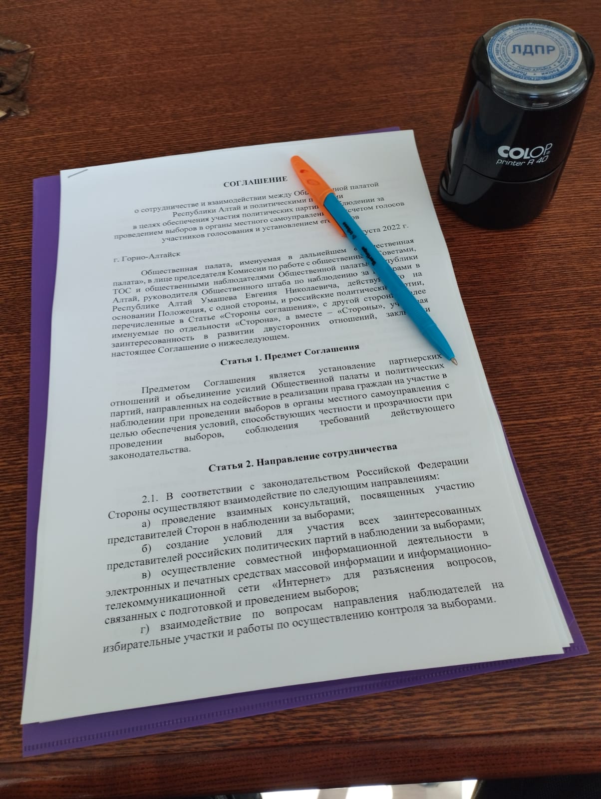 Итогом встречи стало подписание председателем Общественной палаты РА и представителями 6 региональных отделений политических партий, в том числе координатором Алтайского республиканского регионального отделения ЛДПР Дмитрием Казанцевым, вышеуказанного соглашения.