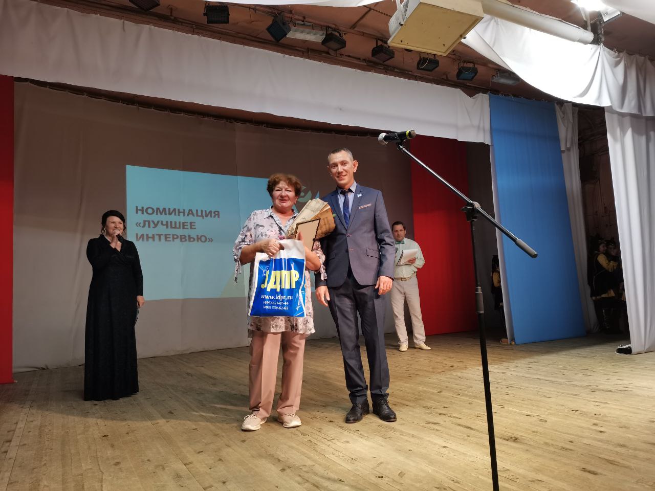 Он награждал Нину Васильевну Богатыреву, журналиста городской газеты "Саянские ведомости" (Саяногорск), победительницу в номинации «Лучшее интервью».