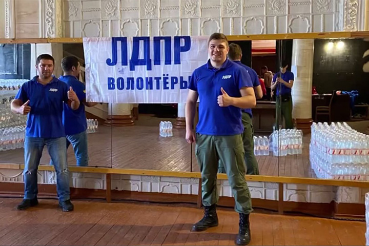 Представитель ЛДПР Михаил Молчанов в составе корпуса волонтеров раздает воду жителям Макеевки