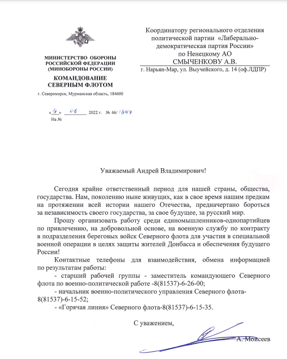 Командующий Северным флотом Александр Моисеев обратился к координатору Ненецкого регионального отделения ЛДПР Андрею Смыченкову с просьбой организовать работу по привлечению, на добровольной основе, однопартийцев на военную службу по контракту для участия в спецоперации по защите Донбасса