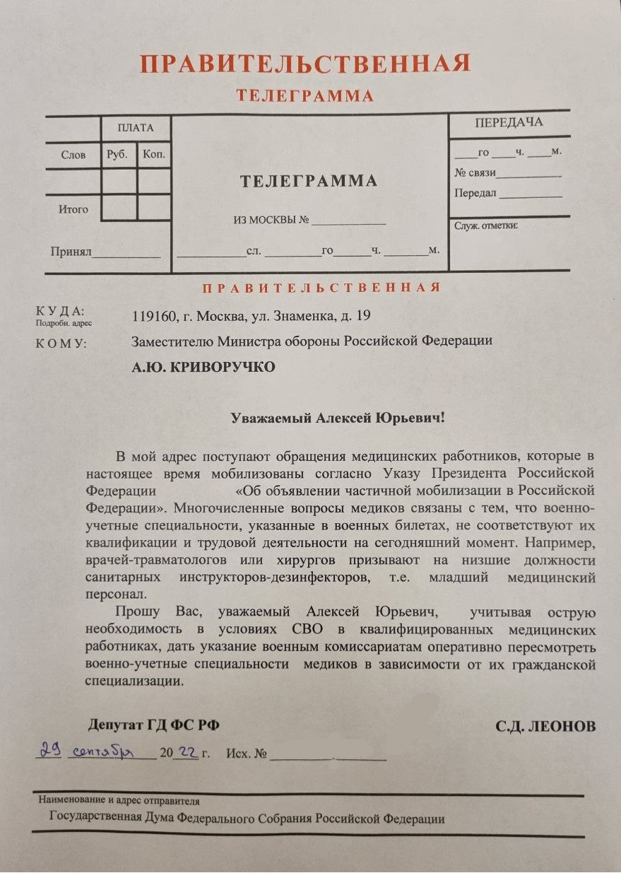 Призванные в рамках мобилизации на военную службу медицинские работники обращаются к депутату Государственной Думы фракции ЛДПР Сергею Леонову по факту не соответствия их профилю работы присвоенной военно-учетной специальности. С тем, чтобы разобраться в этом вопросе, парламентарий направил телеграмму заместителю министра обороны России Алексею Криворучко