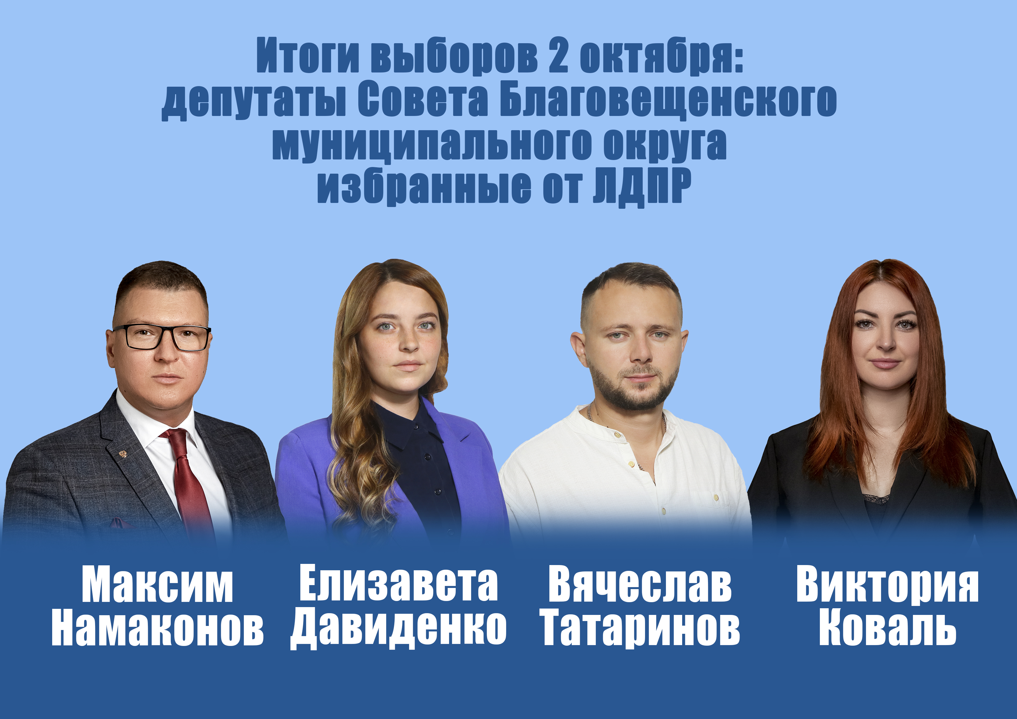 По результатам голосования народными избранниками стали четыре кандидата выдвинутых ЛДПР, а именно: Максим Намаконов, Вячеслав Татаринов, Елизавета Давиденко и Виктория Коваль. Все кандидаты от нашей партии достойно показали себя во время предвыборной кампании и заручились поддержкой избирателей. Мы поздравляем представителей ЛДПР с избранием. Желаем вам дальнейших успехов в законотворческой деятельности, активно и плодотворно работать на благо жителей и процветание Благовещенского округа!