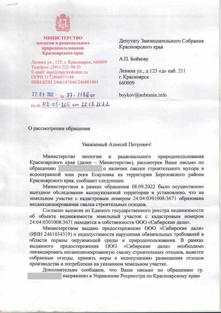 Депутат ЛДПР Алексей Бойков получил сведения об ещё одной стихийной свалке в окрестностях Сосновоборска. Краевое минэкологии в ответе на депутатский запрос сообщило, что зафиксировало свалку строительного мусора в водоохранной зоне реки Есауловка. Собственнику земли направлено предостережение, материалы переданы в Росреестр.