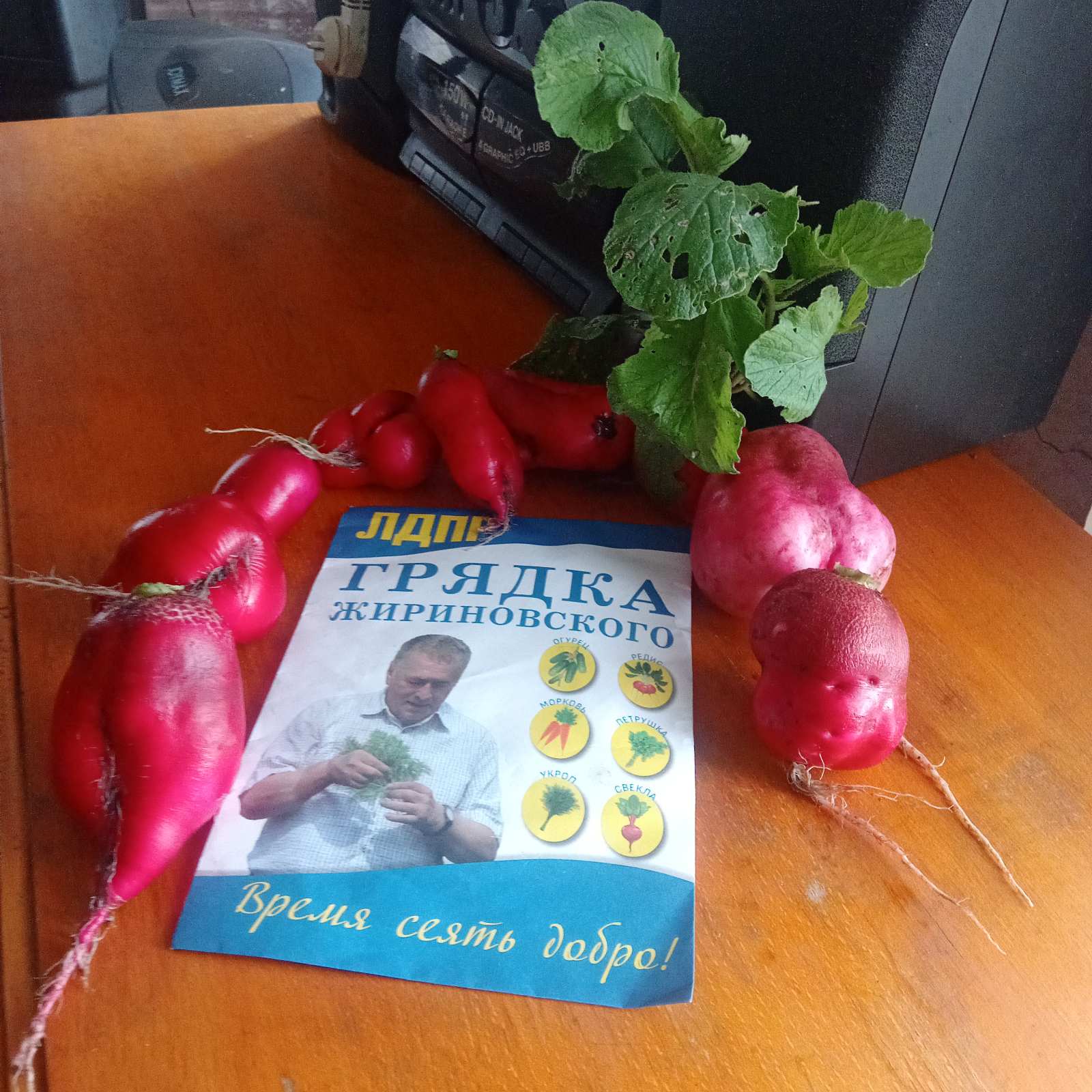 Каждую весну активисты Ульяновского регионального отделения ЛДПР радуют владельцев земельных участков полезными подарками, в виде наборов семян овощных культур. Всё лето и осень садоводы и огородники присылают фото с плодами своего труда. На фотографии из Барыша замечательный урожай редиса, выращенного на родной земле из семян «Грядка Жириновского».