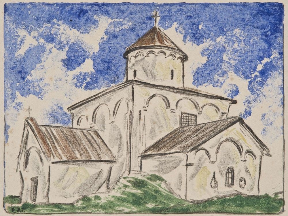 Целый цикл работ Александр Громов посвятил разрушенной во время войны церкви Спаса на Ковалеве. На этих рисунках, исполненных художником с разных ракурсов, максимально полно запечатлен довоенный вид храма — небольшого, приземистого, с сильно выступающей апсидой, увенчанного одной крупной главой.