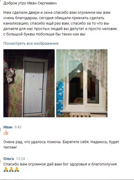 Иван Вершинин: «После длительной переписки с органами власти и предписания областной прокуратуры, сегодня получил сообщение от обратившихся, что в их доме наконец-то отремонтировали окна и двери, обещали сделать канализацию. Люди очень довольны тем, что ближайшую зиму смогут прожить в более теплых условиях.