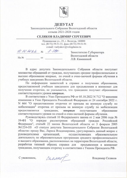 Депутат Законодательного Собрания Вологодской области от ЛДПР Владимир Селяков выступил с инициативой разработать типовой образец справки для учащихся ВУЗов, училищ и колледжей для представления в военкомат