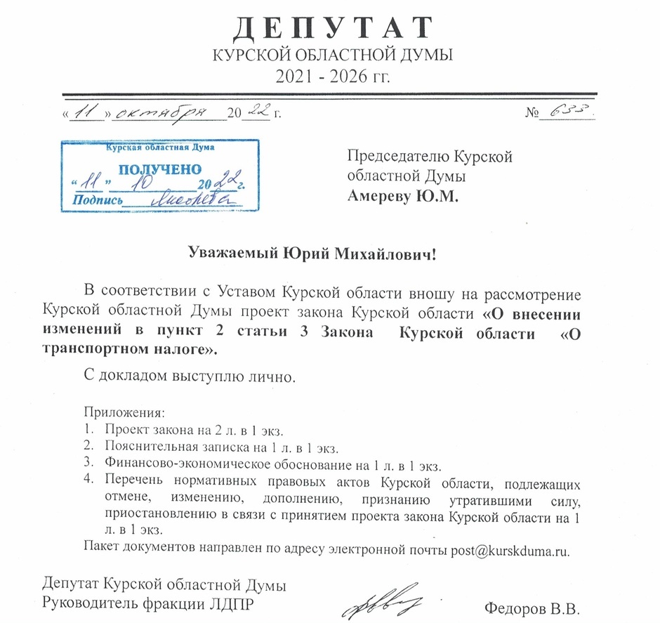 Руководитель фракции ЛДПР в региональном парламенте Владимир Федоров внес в Курскую областную Думу проект закона об отмене транспортного налога для участников спецоперации на Украине