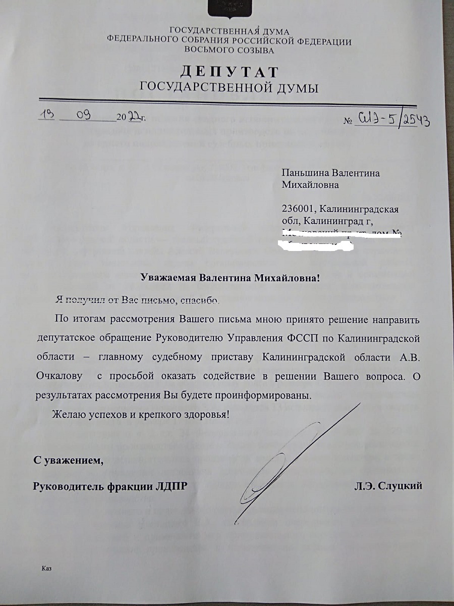 После обращения к руководителю фракции ЛДПР в Госдуме Леониду Слуцкому судебные приставы наконец-то объединили 13 исполнительных производств в одно дело. «Жительница Калининграда Валентина Паньшина куда только не писала, чтобы в отношении должника все дела объединили в одно. Судебные приставы отказывались это делать. Лишь после вмешательства ЛДПР проблема была решена», - рассказала координатор Московского района Калининграда Валентина Гуделайтене.