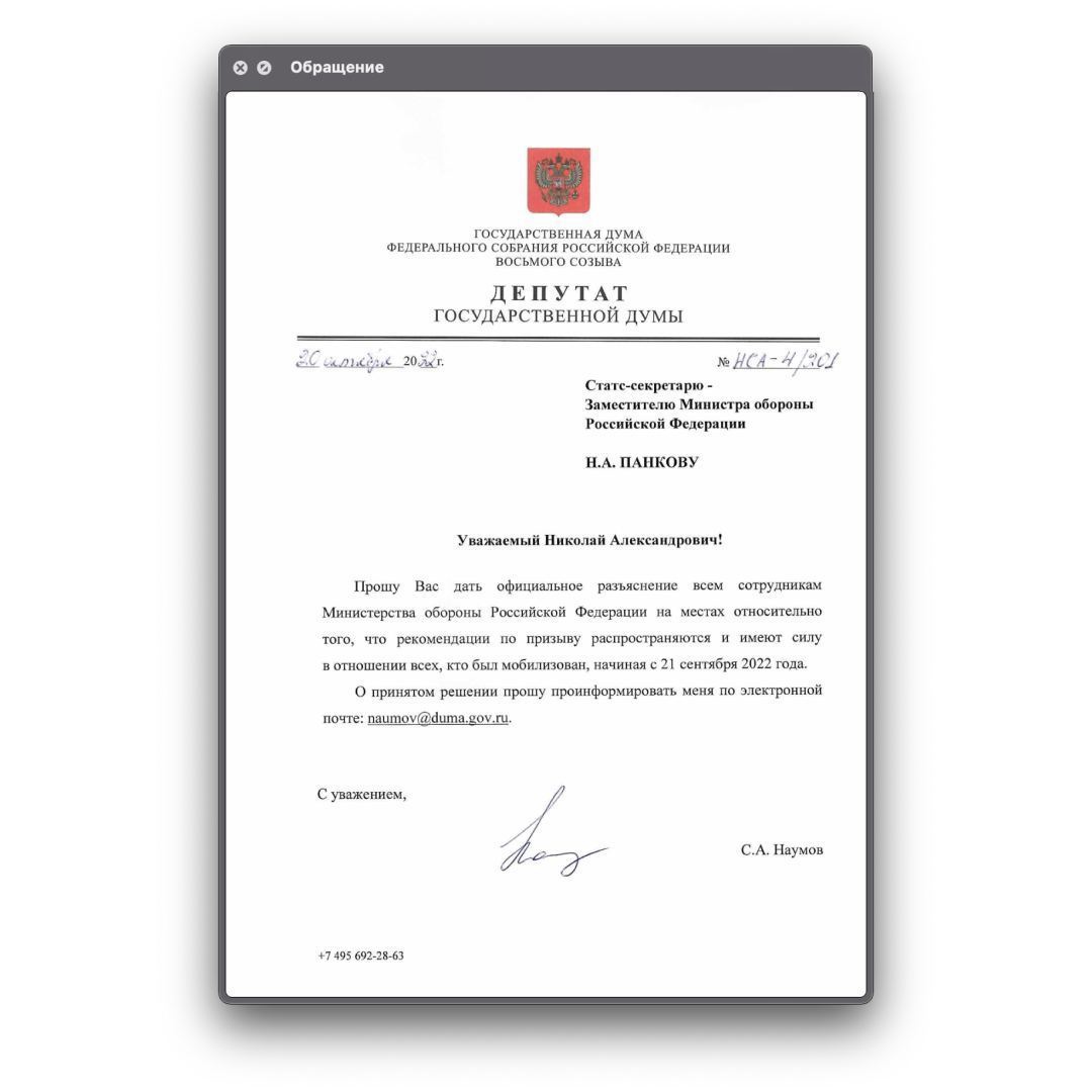 Станислав Наумов обратился к ответственному замминистра обороны с просьбой ускорить доведение до всех сотрудников сути и последствий разъяснений Генштаба по правилам мобилизации. Иначе все полезные рекомендации Минобороны обесцениваются, подчеркнул парламентарий.